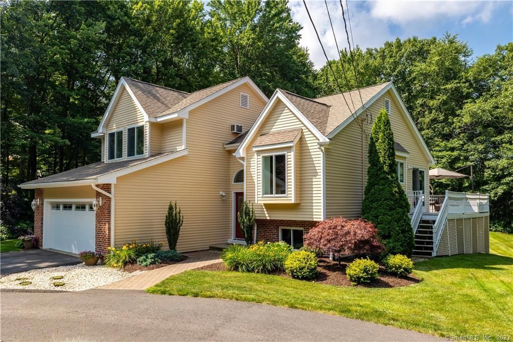 Meticulously cared for Contemporary Colonial set far back from the road with professionally landscaped gardens and a half circle driveway. This home is perfect for entertaining whether inside or out. The home features a new eat in kitchen with soft close drawers, granite countertops and stainless steel Samsung appliances, formal dining room overlooking the 2 story foyer, both rooms with beautiful engineered luxury vinyl-plank flooring, spacious living room with vaulted ceilings and a propane gas fireplace, 1st floor primary bedroom with new carpet, walk-in closet w/built-ins, slider to lower deck area, updated primary bathroom with walk in shower and double vanity, main level powder room and laundry area, both guest bedrooms with new carpeting, closet organizer shelves and fresh paint are on the upper level along with a full bathroom and walk-in attic great for additional storage. Lower level family room with propane gas stove and exercise room or office adds approx. 548sqft.There are multiple sliders leading to the amazing trex decks and above ground swimming pool. The lower deck is wired for a hot tub, there is a gas line for the grill, storage shed, freshly painted exterior including trim, doors and railings in 2022 and 4 zone high efficiency propane boiler. Private location-you cannot see the home from the road. Nothing to do but move in!