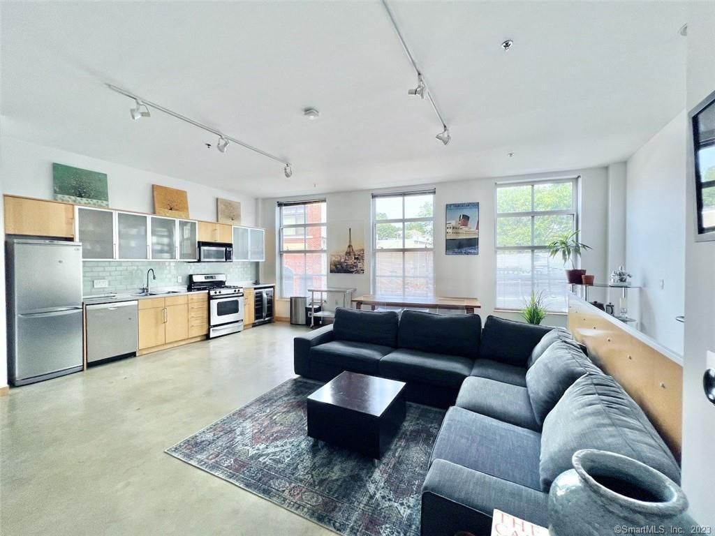 Embrace Metropolitan living in the SoNo Lofts. Experience the perfect blend of contemporary luxury and urban convenience, mere seconds from everything SoNo has to offer: shopping at the SoNo Collection, easy access to the South Norwalk train station, Maritime Aquarium, theater, vibrant nightlife, Veteran's Memorial Park, and picturesque shoreline and more. From the moment you step inside, be captivated by the open floor plan, lofty ceilings, designer lighting, polished concrete floors, and generous natural light streaming through oversized windows which all work to create an ambiance of sophistication. The kitchen is a culinary dream, boasting sleek cabinetry, sparkling tile backsplash, and stainless steel appliances, including a convenient wine cooler. Retreat to the lower level bedroom that offers a custom-designed walk-in California Closet, a tastefully updated ensuite bathroom, and thoughtfully incorporated custom built-ins for additional storage. Unit comes fully furnished. Enjoy the convenience of an in-unit washer and dryer. Garage parking available for additional fee. The complex itself boasts a fitness center, and bike storage room. SoNo Lofts provides an unrivaled urban lifestyle that exceeds expectations, offering an array of amenities in the heart of a thriving district.