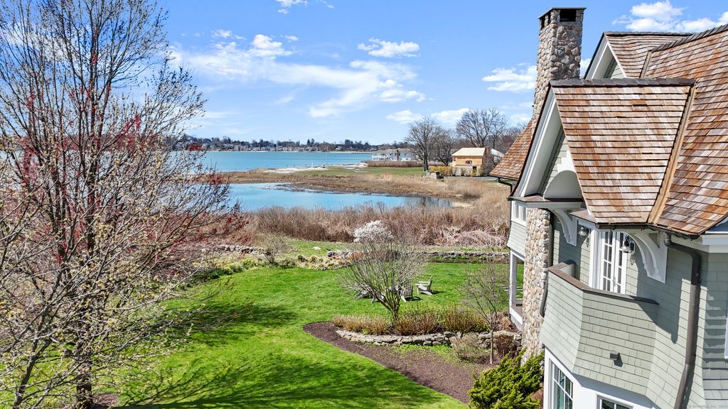 Savor sunsets across Westcott Cove and LI Sound every day from this superb Wallacks Point property. The mesmerizing unobstructed views from this impressive newer colonial are trimmed with perennial gardens and stone walls, and buffered by protected conservation land. Built by in 2007 with forward-thinking design by the architect, Neil Hauck. The interior embraces spectacular South and Westerly views on all three floors. A wide first floor entry is flanked by a light-filled living room and library, and extends through to a beautiful open-plan great room complete with gourmet kitchen, dining area, and family room with stone fireplace, all opening through French doors to a wide deck and covered porch, and large terrace beyond. A well-outfitted pass-through butlers pantry and separate
