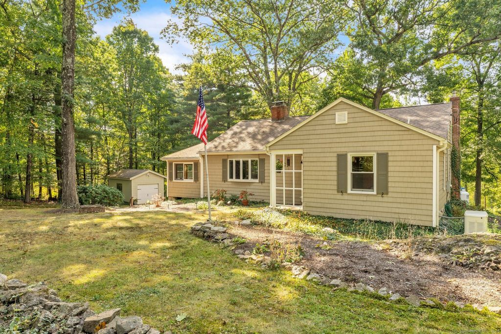 Nestled on 8 picturesque acres, this 3-bedroom, 2-bath home offers an inviting blend of space and tranquility. Spanning 1,480 sqft, this home features a large sunroom with vaulted ceilings and a mini split system for added comfort. The eat-in kitchen has modern stainless steel appliances and granite countertops, making it both functional and stylish. The primary bedroom includes an ensuite, creating a personal oasis. Step outside through the slider to a spacious deck, ideal for outdoor entertaining, while enjoying views of the expansive yard and tranquil pond. Other highlights include a one-car attached basement garage and second detached garage which is perfect for an additional car, storage or projects. The automatic generator provides extra peace of mind for New England weather. If you're looking to relax by your private pond or host gatherings on the deck, this home offers a perfect retreat for those who appreciate nature and comfort in one package.