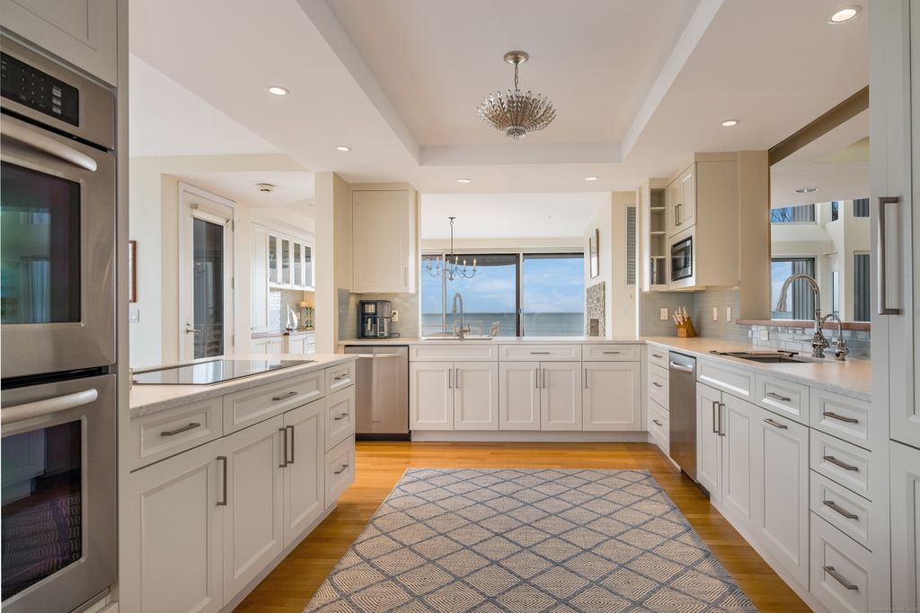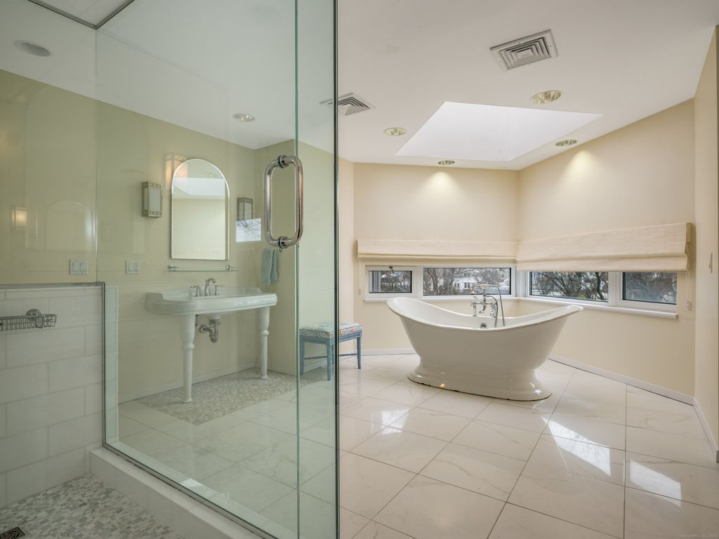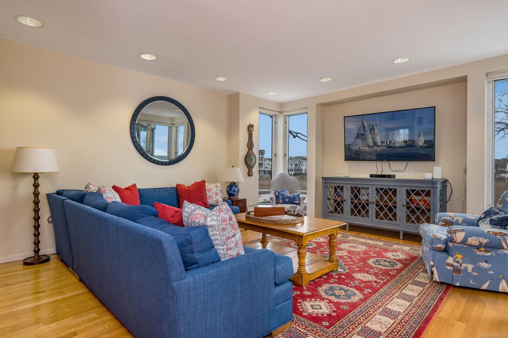 This remarkable example of contemporary design with over 175' of LI Sound frontage and 25' ceilings makes you feel you are aboard ship from the moment you step inside. All white w/clean simple lines, a commanding 2 story wall of glass showcases this beautiful direct waterfront setting in a way not possible with most traditional coastline homes. Display substantial art & furnishings in a whole new way, viewed from the vantage point of a central suspended staircase that seems to float from one level to another. The main level has a wonderful open flow, full of light & provides a comfortable alternate primary BR & bath option should you need it.The gleaming completely new kitchen & fully updated baths are just completed in 2024. 4 very spacious BR's w/baths are privately located from one another. A primary suite w/balcony on the 2nd level includes a bath with soaking tub, shower & a walk-in outfitted dressing room. An additional work/play sleep space has been created from this generous reworked floorplan up just a few steps to a 3rd floor flex space w/walls of glass. An absolute panorama of the shoreline from this room, open to a spacious rooftop patio with an overview only the seagulls otherwise enjoy.This is a sophisticated living option ideal for long stretches of multi-generational living & entertaining in all seasons. An expansive stone patio is the perfect place to relax and unwind. Room for a pool.