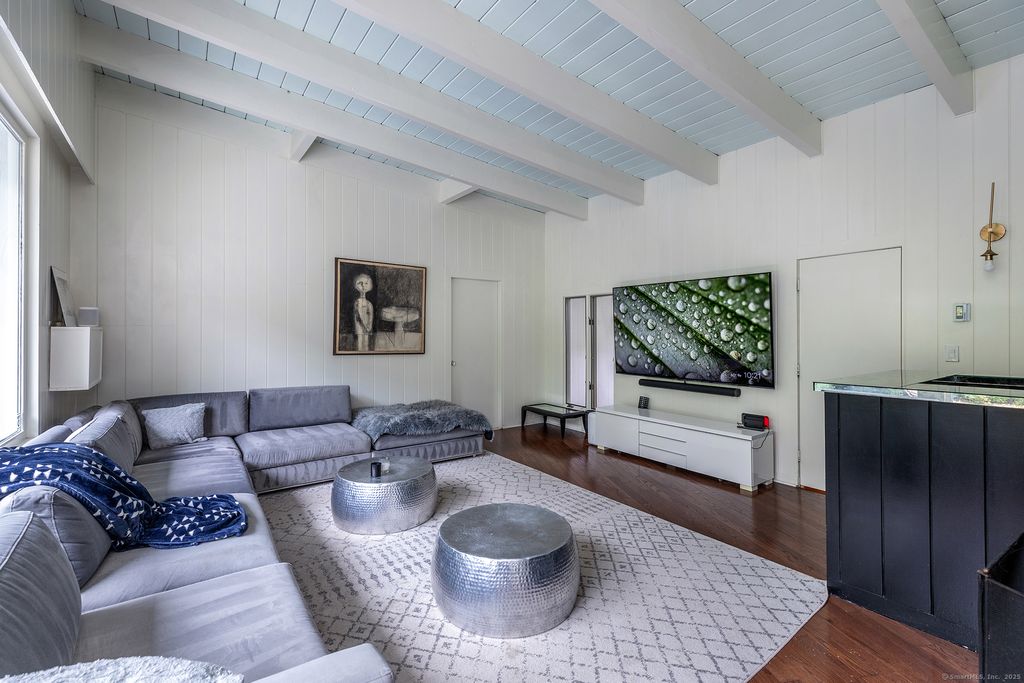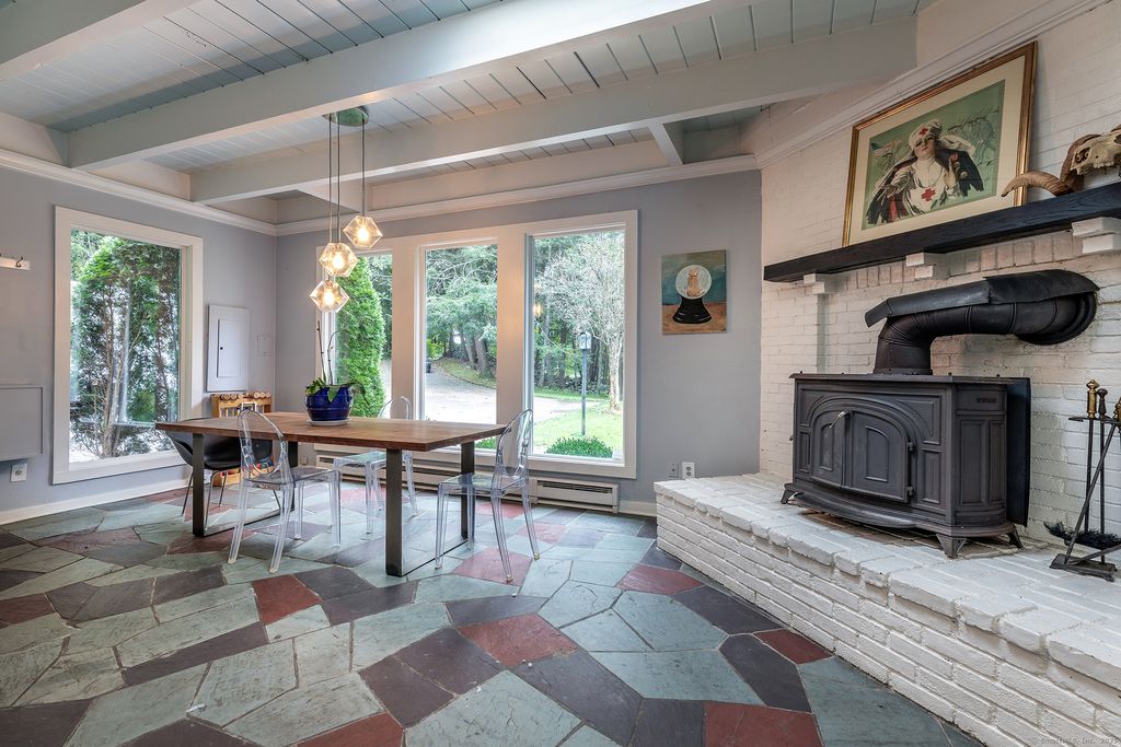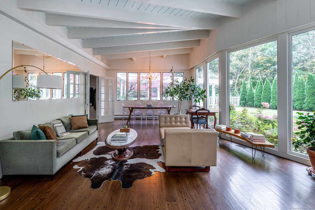 Mid-Century single-level in a convenient Roxbury location. Cool mad-men vibe with floor to ceiling windows, exposed beams, vaulted ceilings, stone and wood floors, and wood paneling. Throughout the house the many windows pour natural light in and give fabulous views over the private and manicured grounds. The home has multiple versatile rooms giving a choice of layout to fit your needs. The formal living room with fireplace includes the dining space and overlooks the granite patio and Scott inground gunite pool. The updated kitchen with stainless steel appliances boasts a stone floor and charming built-in cupboard. The nicely sized family room with fireplace is set near the rear of the house and can also be used as a quiet study or office. The current breakfast room off the kitchen with wood stove and half bath can double as a sitting room or the formal dining room. There is a spacious wood paneled conservatory style sunroom. There are two ensuite bedrooms both with French doors that lead to the lush gardens and grounds. The third bedroom completes the home and has charming built-ins and skylight. The property includes a detached two bay garage with studio/gym and a pool cabana with outdoor shower. House is wired with Ubiquity WiFi. Come take a look!