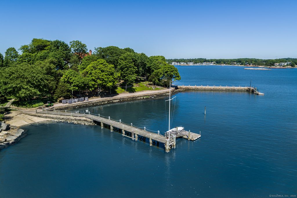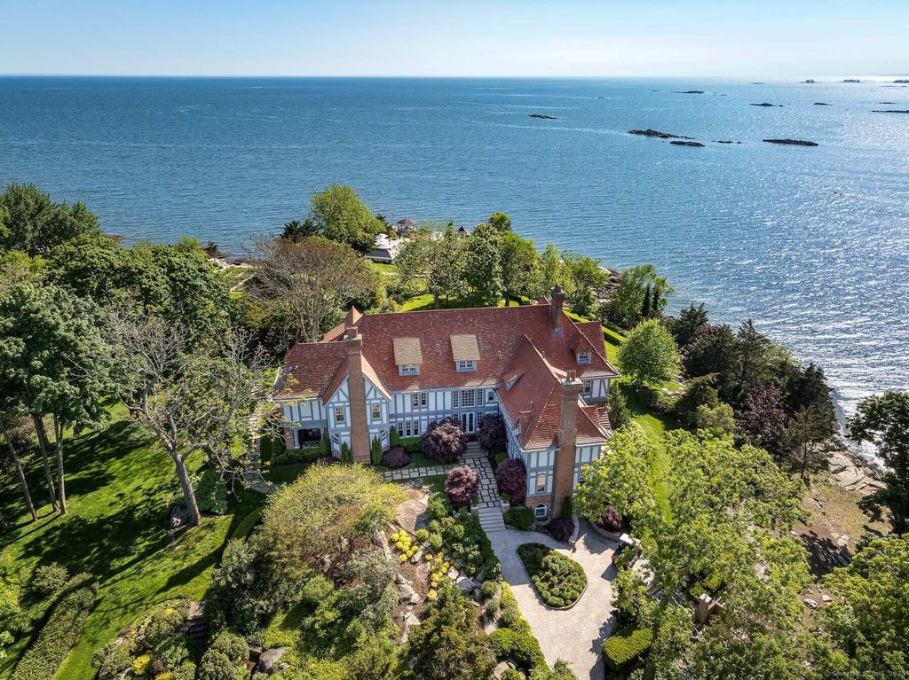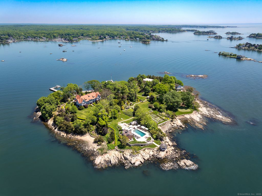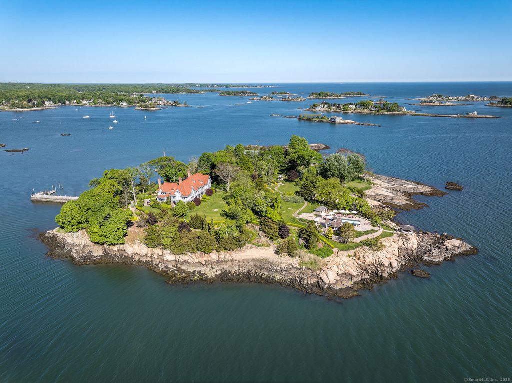 Dazzling summer resort-like oasis on the private, 7.65-acre Rogers Island in the idyllic Thimble Islands archipelago. Surrounded by cinematic 360-degree views of Long Island Sound, this spectacular compound is comprised of a c.1902 10-bedroom Tudor house set amidst beautifully mature landscaping with a waterfront pool with spa, tennis court, putting green, formal gardens and a koi pond. Outbuildings include a pool house, 4-bedroom guest cottage, 2-bedroom staff quarters, loft studio and greenhouse. A generator hut houses a commercial grade 150,000 kW generator. There are 2 docks: one for service, the other for private use. The offering also includes 51 Flying Point Rd in Stony Creek a waterfront destination of its own. At the end of a private peninsula, this invaluable seaside compound provides additional staff/guest housing, parking with Tesla chargers and private dock - for easy access to and from the island.