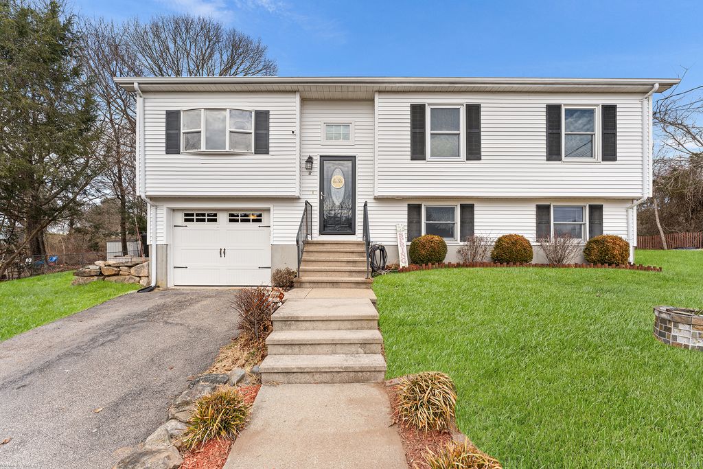 Welcome to this charming raised ranch at 8 Glasgo Rd, nestled on a quiet street in Pawcatuck, CT. This lovely home offers 3 bedrooms and 1.5 baths, perfect for flexible living. The dining room flows seamlessly into the spacious kitchen, featuring elegant granite countertops and sleek stainless steel appliances that include a double oven range and a brand-new refrigerator. The living room with vaulted ceilings creates an open and inviting atmosphere with French doors that lead out to the large wraparound deck and above-ground pool - ideal for relaxing or entertaining. The main floor includes three comfortable bedrooms and a full bath, while the finished basement boasts flexible living with an expansive room that was used as the primary suite and the second room used as a large walk-in closet. The half bath and laundry room complete this beautiful home. The partially fenced backyard is great for outdoor gatherings with additional storage space in the shed. Located just minutes from downtown Westerly, enjoy easy access to great restaurants, shopping, and Wilcox Park. Award winning school system, with West Vine elementary school named as best in state! Plus, you're only 15 minutes away from Rhode Island's beautiful beaches, making this the home that you won't want to miss!