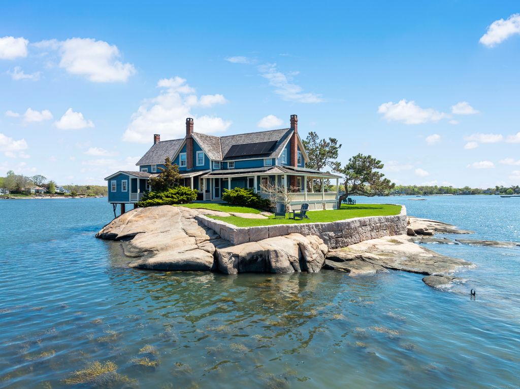 THIMBLE ISLAND DREAM ESCAPE A STONE'S THROW AWAY FROM MAINLAND & 14 MILES FROM THE HAMPTONS! Leave the hustle & bustle of everyday life behind w/your own 1.04 ACRE patch of paradise in the fabled Thimble Islands. Offered fully furnished & includes 2 acres of deeded adjacent shellfish beds. NEW ROOF, NEW SEAWALL w/expanded grassy yard, NEW IRRIGATION SYSTEM, NEW pink granite wall, NEW complete freshly painted exterior, SOLAR, and more! Easily accessed from charming Stony Creek & just a 10-min drive from dock to I-95, you'll feel a world away on Beldens Island. Get whisked away w/enchanting views of Long Island Sound & the quiet, protected archipelago coastline once used as a treasure trove for pirates. Up from the private dock & sandy beach awaits indigenous pink granite stone walls, a rolling green lawn w/irrigation, & perfectly placed shade trees. Step back in time when entering the well-preserved c.1912 7-room cottage richly adorned w/vintage hardwood floors & wainscotted walls & ceilings that lends a maritime feel. Country kitchen w/4-burner gas stone w/griddle, refrigerator, coal stove, & butler's pantry. Outdoor built-in gas grill makes summer BBQs & alfresco dining a breeze. Enjoy meals in the spacious combined dining/living room anchored by stone fireplace. Sparkling water reflections from surrounding windows gives the impression that one is levitating above the sea.