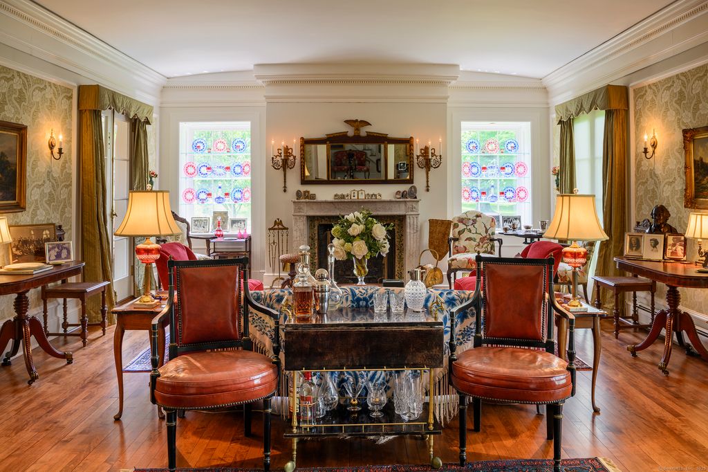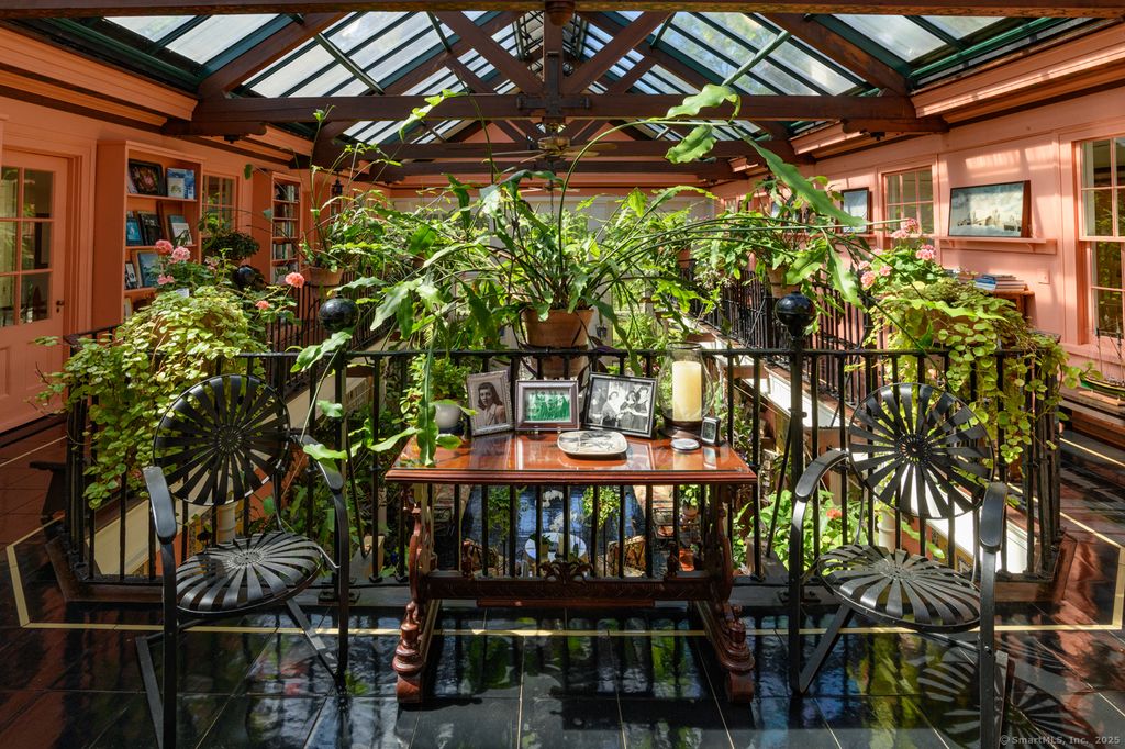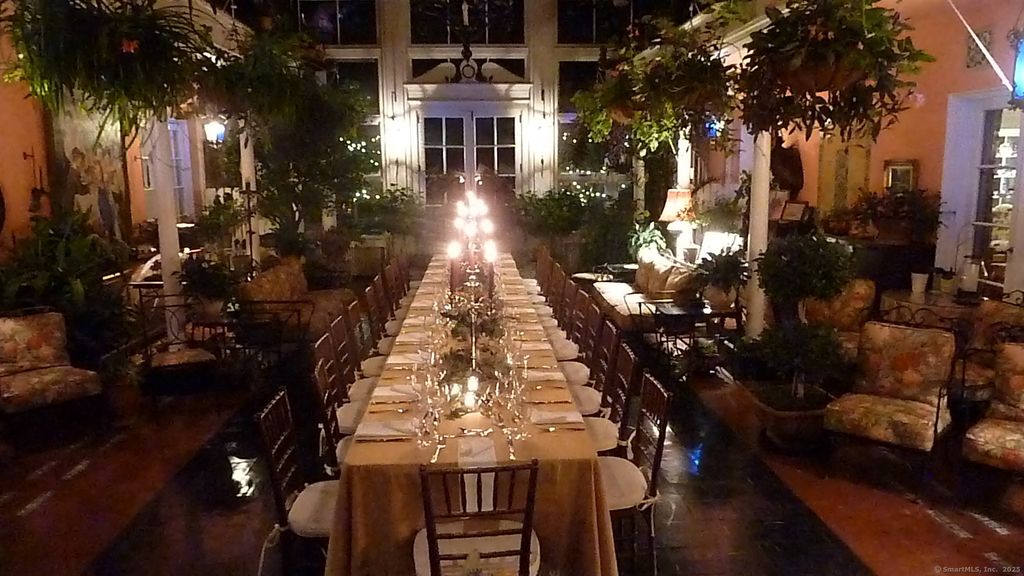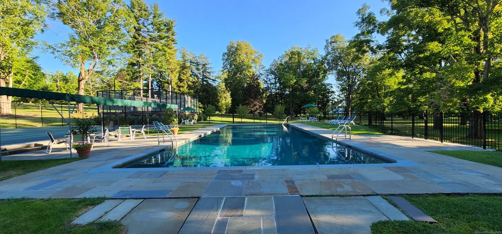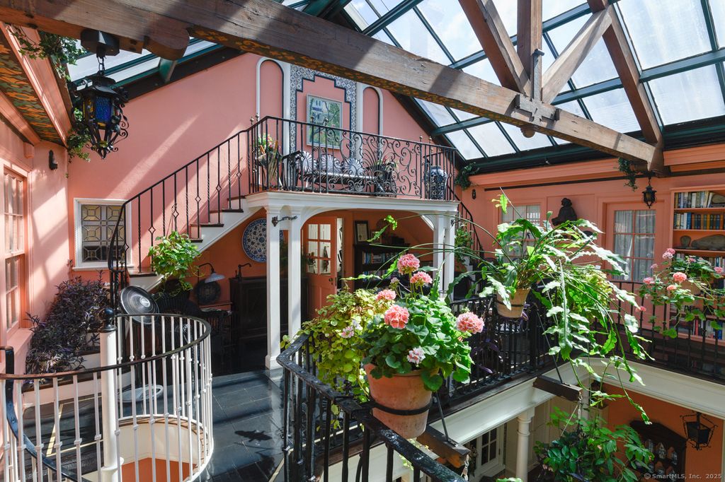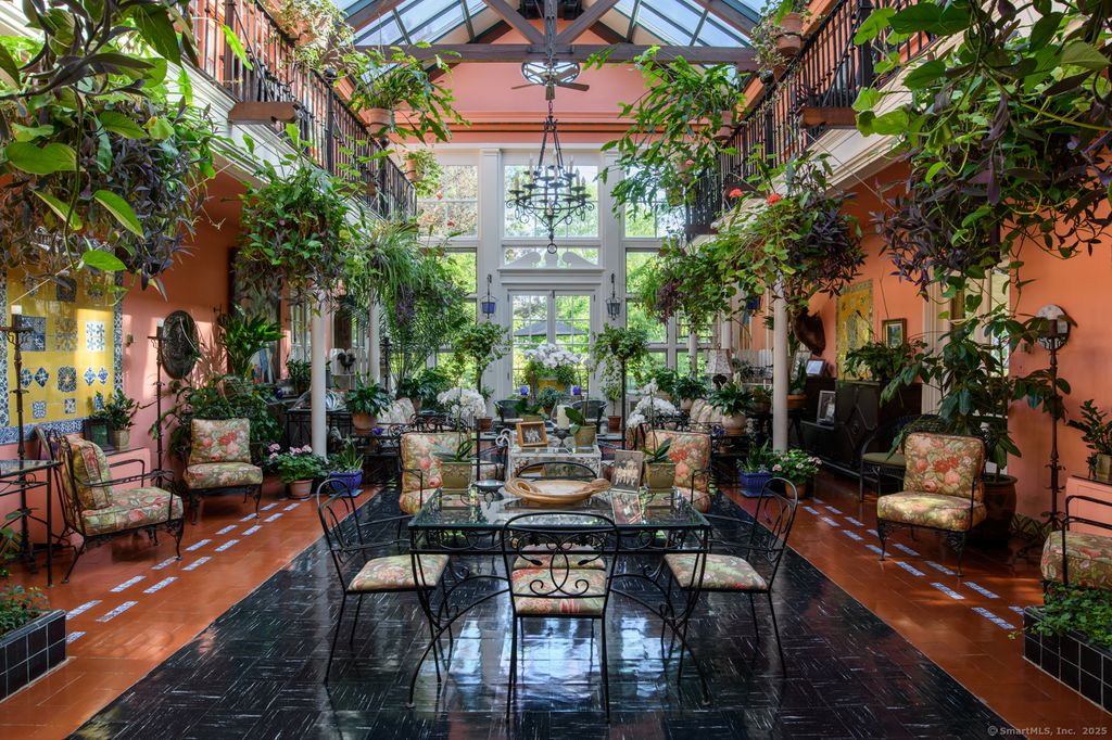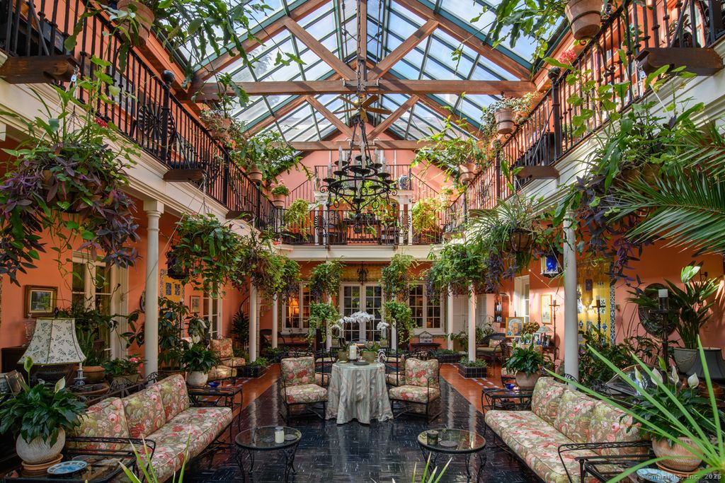 Enjoy estate living with the convenience and ease of a shared community. Amenities include a 70ft heated pool, tennis and separate paddle/pickle courts. Owned by a noteworthy family for over 100 years, this is a rare opportunity to reside in one of Sharon's most treasured properties. The home encompasses the majority of the original mansion and was thoroughly renovated in 2013 with tasteful choices that maintain and enhance the original character. 2 wings which once surrounded a courtyard are now covered with a magnificent 3 story glass ceiling and heated for year-round use. This New Orleans style atrium is adorned with wrought iron bannisters, stenciled beams, romantic tile fountain, and antique lanterns all accentuated by an exquisite array of plants/trees. The atrium is the highlight and heart of the home, hosting many elegant dinners and weddings. The plants have been thriving for decades and can be included in a sale. There is a plant caretaker in place. 8 total bedrooms include primary bedrooms on both floors. Many of the bedrooms open to the interior balcony overlooking the atrium. One is currently used as an office; a second as a gym. 7 Full baths and 2 powder rooms. The perfectly preserved vintage Art Deco bathroom tiles & William Morris wallpapers add to the elegance. The kitchen opens to a book-lined library with fireplace & eating table. Formal dining & living rooms, allowing for extensive entertaining spaces when hosting larger groups. 7 Fireplaces in total.