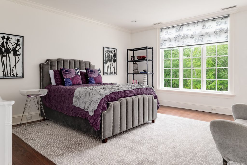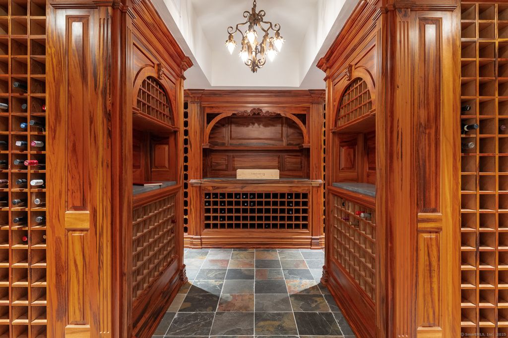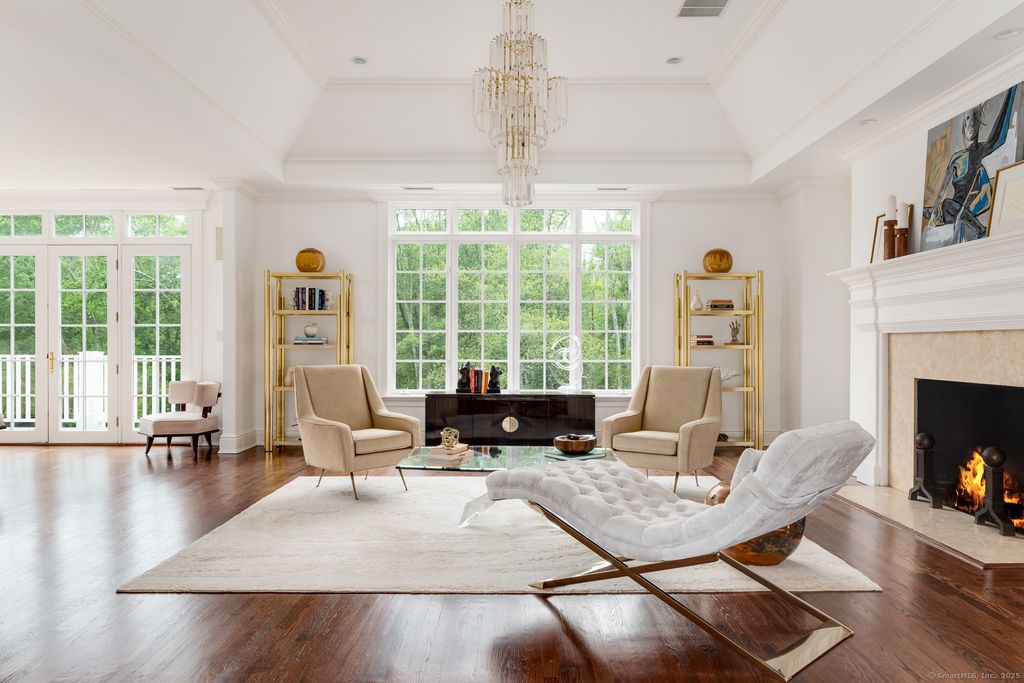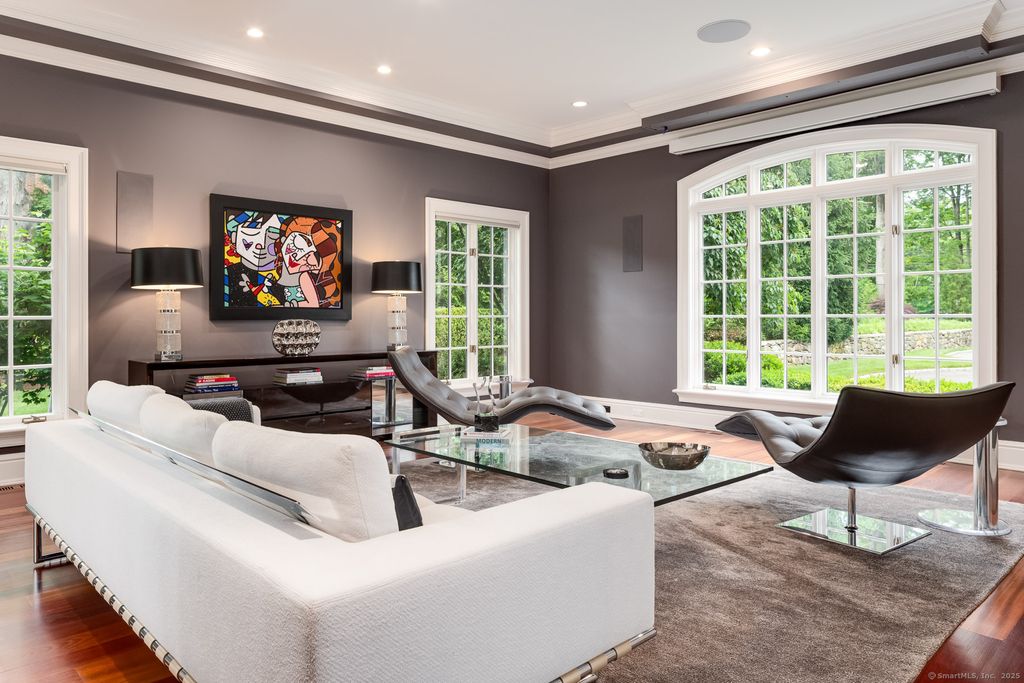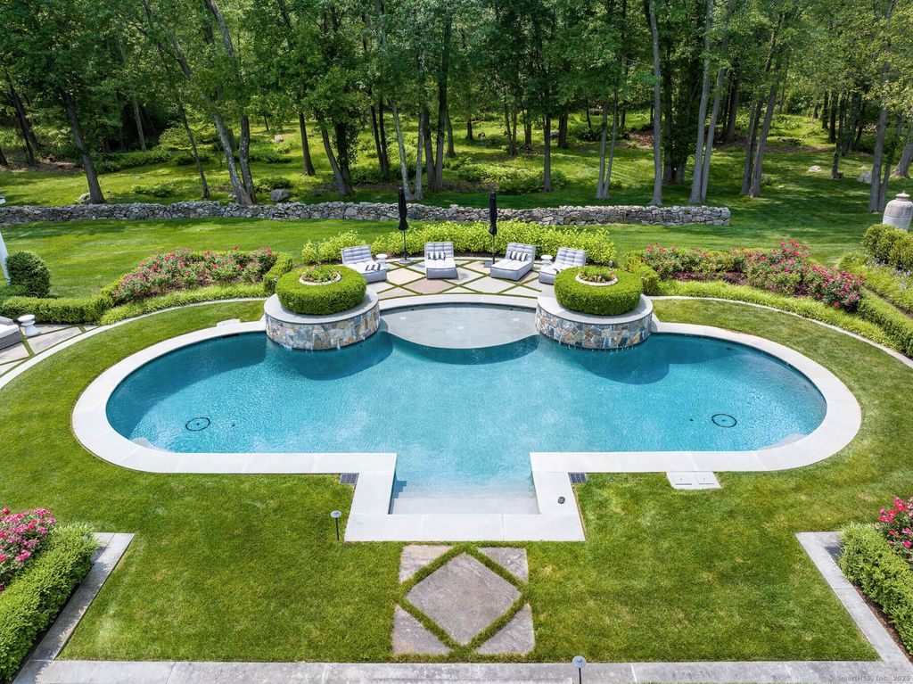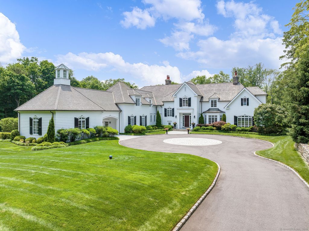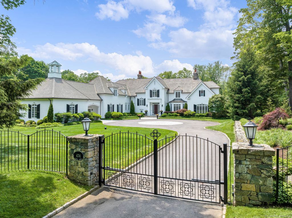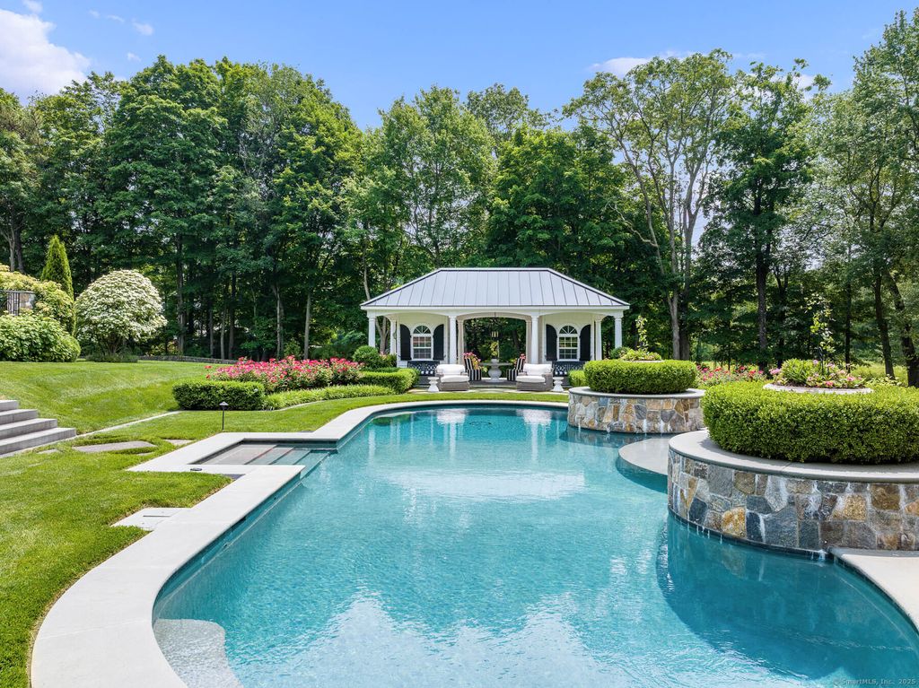 Discover elegance at this custom stone and shingle French Colonial on 4.9 bucolic acres on New Canaan's coveted west side. Bordering an 11-acre land trust, this 8,332 SF home, plus 2,300 SF finished lower level, offers privacy and proximity to downtown New Canaan and NYC commutes. The exquisite gardens, Inspired by Villa d'Este, create a resort-like setting with spectacular views from every window. The grounds feature parterre gardens, a pool, cabana, bluestone terraces with custom wrought iron railings, and a treed meadow. A Belgian block-lined driveway leads to two 2-car garages with a porte-cochere. Grand interior spaces have oversized windows, 10-12' ceilings, Brazilian cherry floors, five marble fireplaces, and deep moldings. The 1,500 SF kitchen and family room dazzle with a Pietra Cardosa island, Viking range, Sub-Zero appliances, and French doors to terraces. The primary suite features a 13' cathedral ceiling, balcony, and luxurious bathroom. Four additional large en-suite bedrooms provide overnight guests and family complete privacy. A study area, lower-level sixth bedroom, playroom, wine cellar, gym, and sauna complete the home. Fencing, electronic gates, and alarm system ensure a safe environment for the entire family. Modern systems include central vacuum, security, water purifier, and EV charger. This is a forever home to be treasured through the generations.
