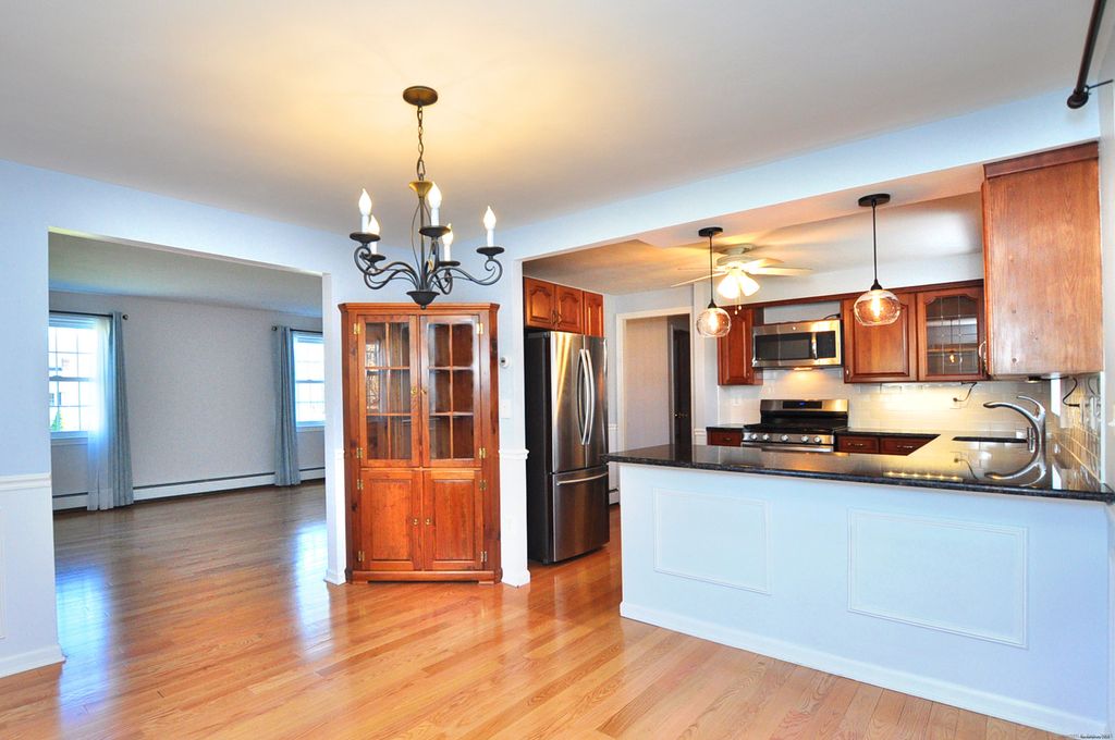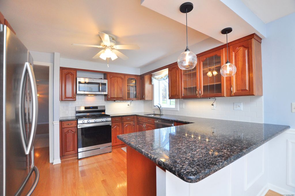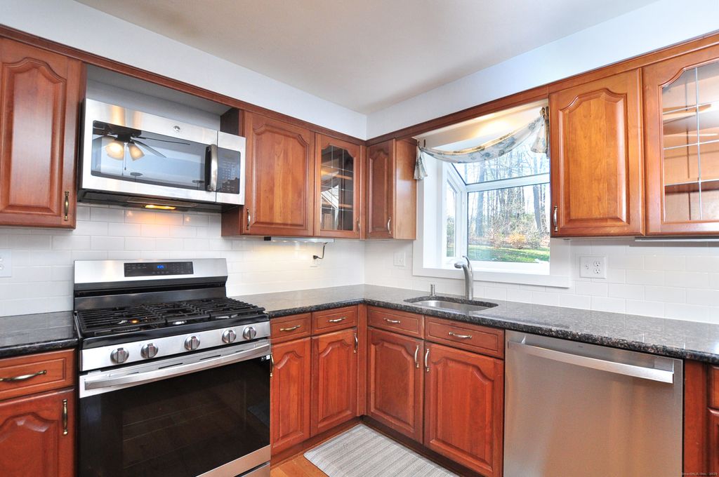 Boasting exceptional curb appeal and an inviting and pristine interior, this stunning four bedroom home radiates warmth throughout! Stunningly updated, the remodeled kitchen offers rich cherry cabinetry, an abundance of sleek, black granite countertops, stainless steel appliances and newer hardwood flooring. Open to the kitchen and ideal for serving casual or elegant meals, the dining room combines the beauty of dazzling hardwood flooring, built-ins and the elegance of wainscoting. The expansive living room features gleaming hardwood flooring and a gas log fireplace, the perfect complement to cool New England evenings. On the main level, the den offers a cozy retreat and possibility of use as a home office or study. Completing the main level is a guest half bath. On the second level, the Primary bedroom suite includes a walk-in closet and a private full bath. Three additional bedrooms and a second updated full bath round off the second level. Partially finished, the lower level provides great space and the flexibility for a recreation room or home gym. Unwind as you soak up the beautiful backyard vistas from the enclosed three season porch. The spacious rear deck (19'x14'), overlooking the expansive backyard, is perfect for outdoor entertaining, summer barbecues or simply relaxing. There is tremendous value with thermal pane windows, low maintenance vinyl siding, oversized two-car garage with newer garage doors and the Weil McLain furnace. Come on...Let's take a look inside!