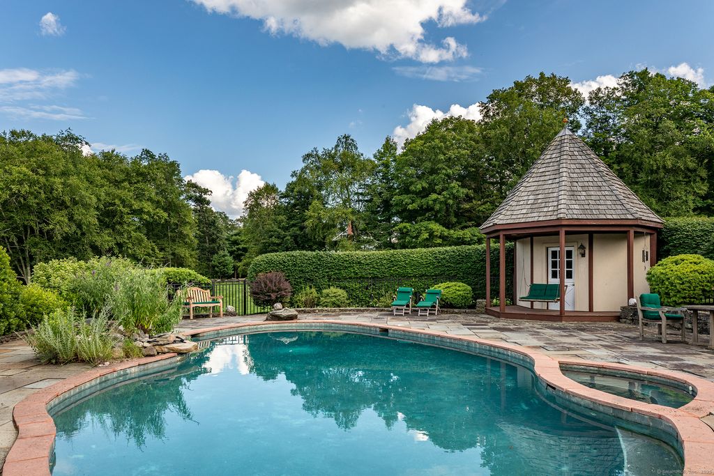 French Chateau in Bridgwater. Considered one of the most coveted streets in the surrounding areas. Stone wall with gated entrance. Double height foyer.Atrium living room with wall of French doors and marble fireplace. Sexy bar leads to the library. Open & gourmet kitchen with fireplace and butler's pantry. Formal dining room. First floor primary suite with marble bath and massive walk-in closet. Billiards room and 2 half baths. Upstairs guest rooms are both with en-suite baths. There is a perfect spot for a 4th bedroom ready for your ideas in the lower level or finish off a portion of the barn/garage. Fabulous terrace is accessed from most every room overlooks the lush grounds, Gunite pool with spa, cabana and views. Complete privacy on a coveted & prestigious street with a majestic presence. The lower level with an additional 1/2 bath and 4 car parking spaces. Additional detached garage with 4 additional bays and one oversized for a boat and an upstairs loft that could be finished. The boat launch to Lake Lillinonah is just at the end of the street. Generator. The property has been meticulously maintained and is magical. This is a true, trophy property not to be missed. Quintessential New England at it's best.