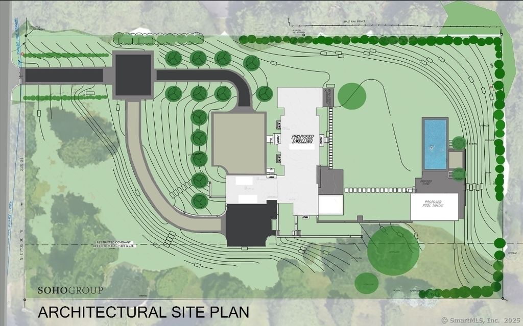 Exceptional commanding luxury estate under development in prime mid country location. The 2.39 acre gated & elevated site includes a 13,326 SF main house with 6 bedrooms / 8.3 bathrooms across 4 levels of custom crafted living space with indoor parking for 7 cars - plus an outfitted 800 SF luxury pool house with vaulted ceilings, heated floors, stone fireplace & full bathroom overlooking a large terrace, 50 ft. pool with integrated spa & sundeck plus a sprawling lawn area with sunken fire pit & Bocce court. Designed by the SOHO Group, this striking transitional home with soaring ceilings & tremendous light is perfectly layered in clapboard, hand chiseled fieldstone & oversize glass. A 3-stop elevator plus an amenity-filled lower level complete the offering. Est. completion date: Dec. 2025