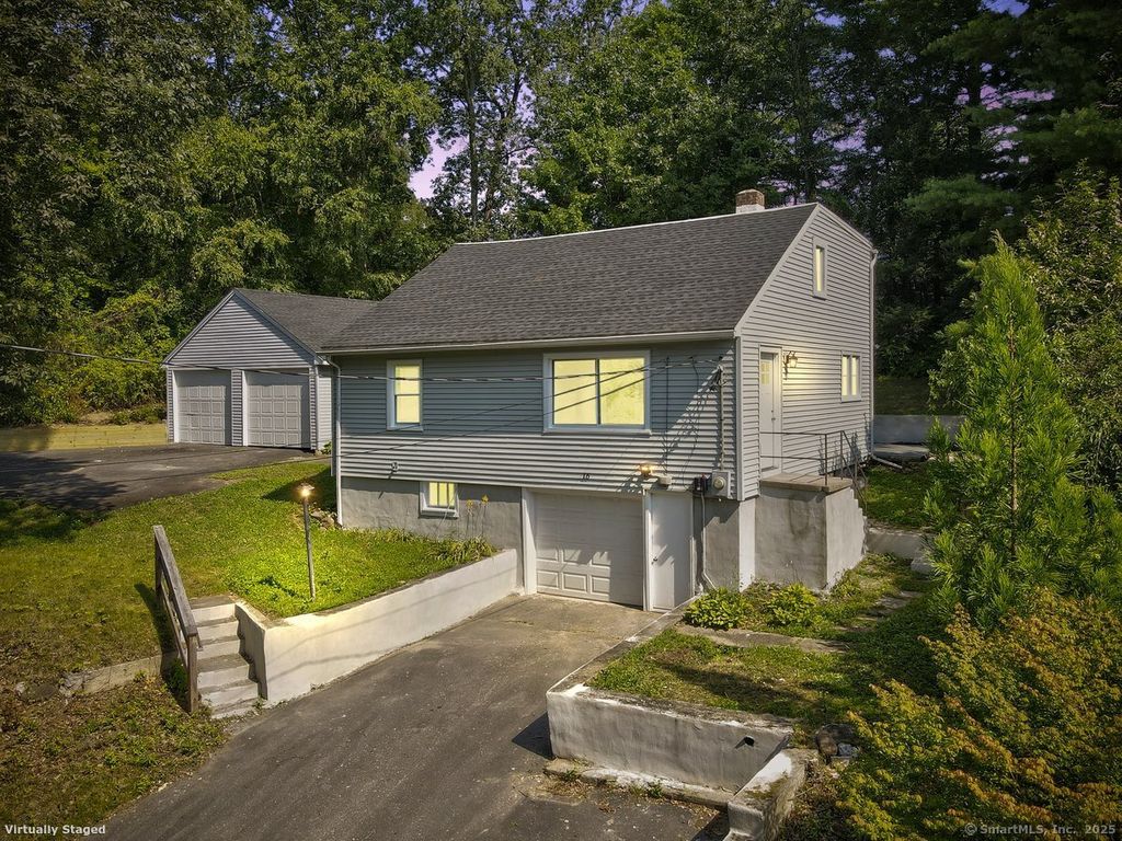 Great new price! Welcome to life by the lake in the sought-after Lake Garda Association! This beautifully remodeled Cape style home offers a perfect blend of comfort, style and function with lake living just moments away. Featuring 3 bedrooms, 2 full baths and a thoughtful layout, this home has something for everyone, including incredible garage space. The main level boasts an eat-in kitchen with hardwood floors, white shaker cabinets, quartz countertops with breakfast bar and stainless steel appliances-perfect for casual meals or entertaining. The spacious living area and two main level bedrooms also feature gleaming hardwood floors and a beautifully updated full bath with tiled shower. Upstairs, you'll find a quiet office space and a private primary suite with walk in closet, luxury vinyl plank flooring and a spa-like bath with soaking tub, tiled shower and tile flooring. The finished lower level includes a large rec room, laundry area and a 1 car garage under the house for every day parking. This home also boasts a detached 2 car garage 24x24 with extra height and depth, 10x8 doors, ideal for boat storage, hobby space, workshop or just to accommodate extra vehicles. This versatile setup is ideal for hobbyists, lake-life enthusiasts or anyone needing extra space. With vinyl siding, thermal windows and a welcoming lake community, this home is ready for year-round enjoyment. Don't miss the chance to live near the water-schedule your private tour today!