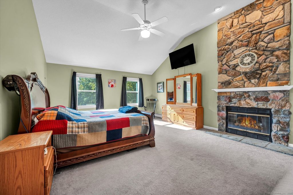 Set at the end of a quiet cul-de-sac in a desirable neighborhood, this spacious colonial offers 6 bedrooms and 3.5 bathrooms. The main level welcomes you with a bright foyer leading to a sun-filled living room and a cozy den with pellet stove. From the den, access a half bath, the kitchen, or step through the storm door to a two-level Trex deck. The kitchen boasts granite countertops, stainless steel appliances, and an eat-in area, with direct access to the formal dining room or oversized 2-car garage. Upstairs, you'll find 5 total rooms and 2 full baths, including a primary suite with fireplace, walk-in closet, and Jack & Jill bathroom. Four additional bedrooms, all with closets, offer plenty of flexibility. The finished basement provides an ideal in-law suite, featuring a full kitchen, laminate flooring, bedroom, walk-in closet, and laundry hookups. From there, you can step outside to a private backyard designed for entertaining-complete with gazebo, heated above-ground pool, playscape, and more. Recent updates include a generator, windows, roof & gutters (2017), boiler (2020), water softener (2020), hot water heater (2021), well pump, and owned propane tanks and solar panels. The solar panels produce surplus electricity, earning the sellers' monthly credits on their utility bills. Move-in ready and filled with features, this home blends comfort, functionality, and charm inside and out.