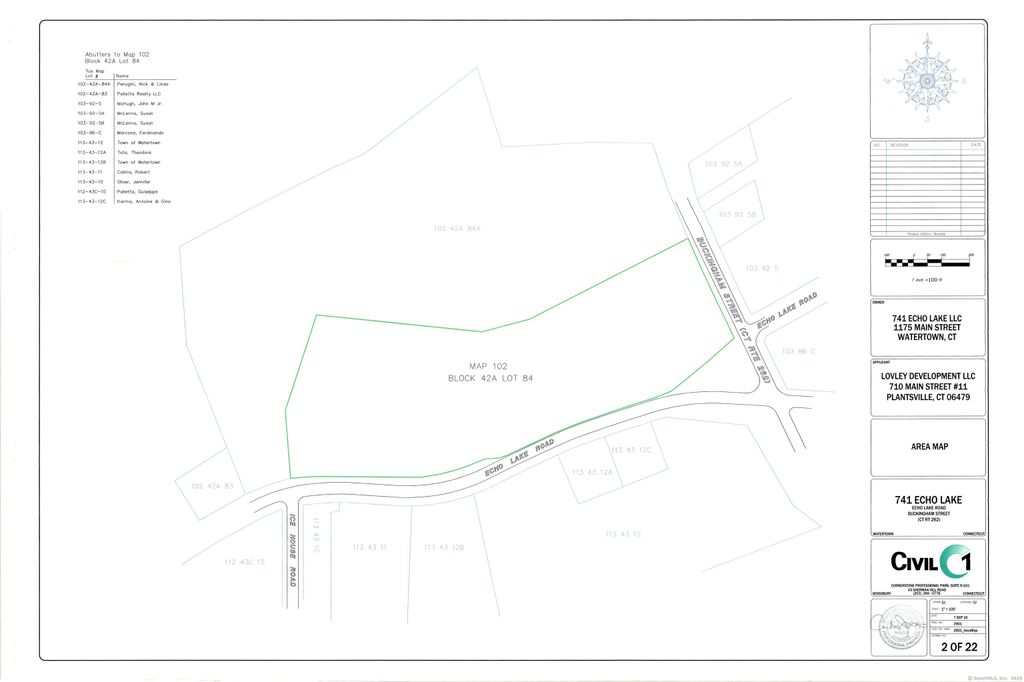 Rare Opportunity to acquire and develop 17.29 Acres of land situated at intersection of Echo Lake Road and Buckingham Street [ Rte 262] in Watertown Ct Property is situated in an R-30 Zone District augmented by application of Residential / Office Transition Overlay Zone { Section 4.4 Watertown Zoning Regulation] Overlay Zone permits Multifamily Dwellings with density not to exceed 8 units Per Acres { Sec. 4.4 D. 4 WZR] Size & Zoning: 17.29 Acres - R-30 Zone + RT Transition Zone Overlay Unit Density: 8 units Per Acre Infrastructure: Public Water - Public Sewer - High Speed Internet - Schools Site Access: Corner of Echo Lake Road & Buckingham Street [ Ct Rte 262] Market Opportunity: Limited Multifamily Development / Together with Statewide Demand Site Plan Approval for Phase I - 21 Units - Per Site Plan