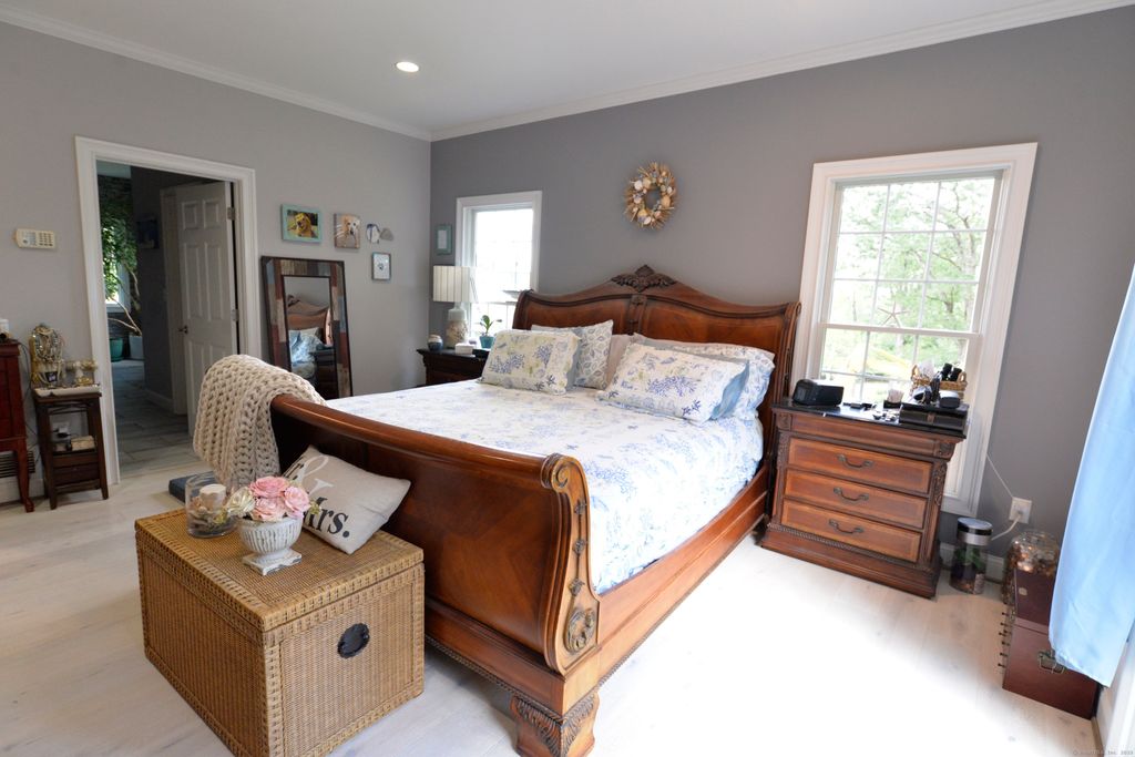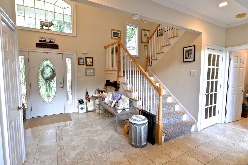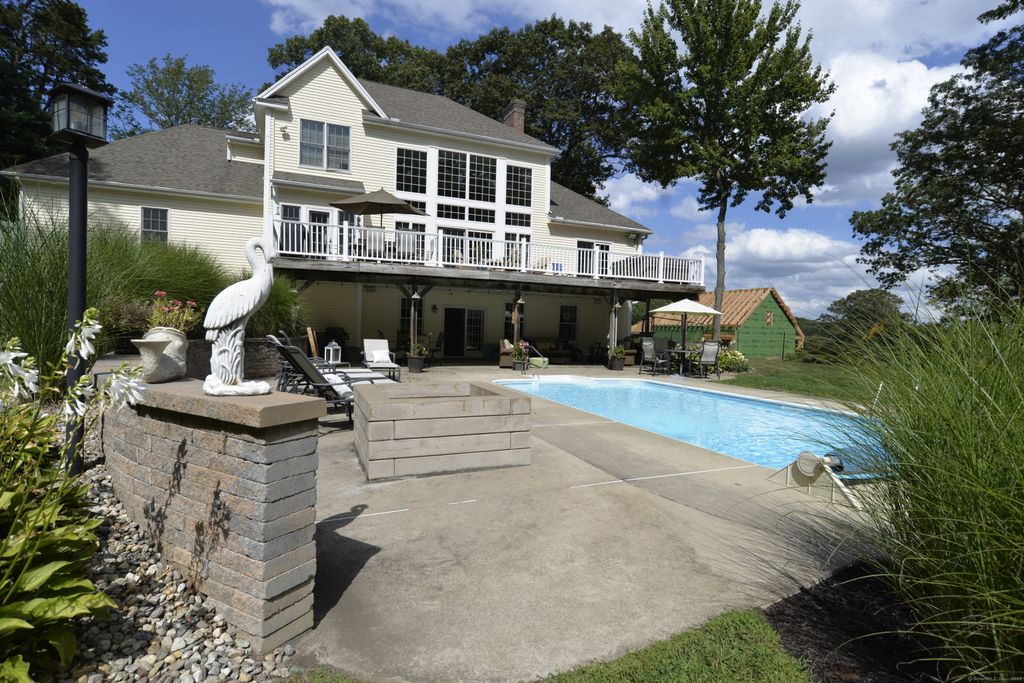 Welcome to a home that truly blends comfort, style, and space. This contemporary colonial offers 3,416 square feet of thoughtfully designed living space set on 1.3 acres of beautifully landscaped privacy. The modern roof lines and curated stone walls offer standout curb appeal, while the in-ground pool brings a resort-like vibe to your own backyard. Inside, the heart of the home is the chef's kitchen, outfitted with rich cherry cabinets, granite countertops, and stainless steel appliances-a great space for culinary adventures or weekend gatherings. The first-floor primary bedroom includes French doors leading to the deck, with picturesque views of the pool and surrounding grounds. Upstairs, two additional bedrooms offer space and comfort, with a hallway balcony overlooking the dramatic two-story living room-a layout that adds both elegance and connection between floors. The walk-out basement is built for entertaining or relaxing in style. Enjoy a cozy night in by the wood stove, mix up your favorite drinks at the wet bar, or store your favorite vintages in the dedicated wine cellar.