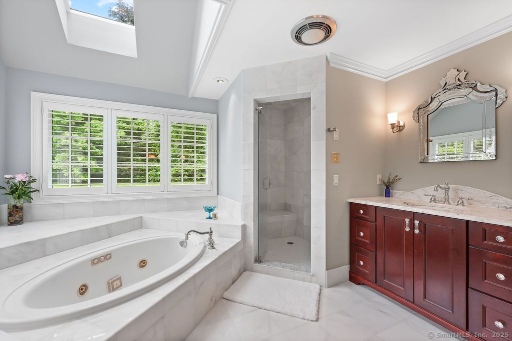 Elegant Cape Style Estate with Pool on 3.74 Serene Acres Home has 5 Beds, 5 Full and 2 Half Baths, 5,966 square feet on main living space with additional 1,350 in lower level. Step through double front doors into a world of refined craftsmanship and sun-drenched spaces. Private formal living, dining, and library rooms showcase meticulous millwork, while the heart of the home, a breathtaking kitchen open to the family room-soars two stories high. Three sets of Palladian windows and nine brand new skylights frame leafy views and bathe the stone fireplace wall in natural light. Chef's kitchen, new GE Monogram refrigerator with custom panels, Carrara marble island, soapstone counters. Beautiful open-concept living. Bedroom suite mix, five spacious bedrooms, all ensuite, offer ultimate flexibility for family and guests. Lower level retreat, 1,350 sq ft of extra space featuring a full gym and room to customize further. Outdoor oasis, in-ground heated pool and spa ,edged by stone terraces and lush, lightly wooded grounds, fenced garden area; your private sanctuary for summer gatherings. Peace & convenience, minutes to major highways, shopping, and dining, yet surrounded by acres of tranquil landscape. With a new roof overhead, modernized skylights, and premium appliances already in place, this residence blends turn-key confidence with timeless style. Discover the rare combination of grandeur and privacy.