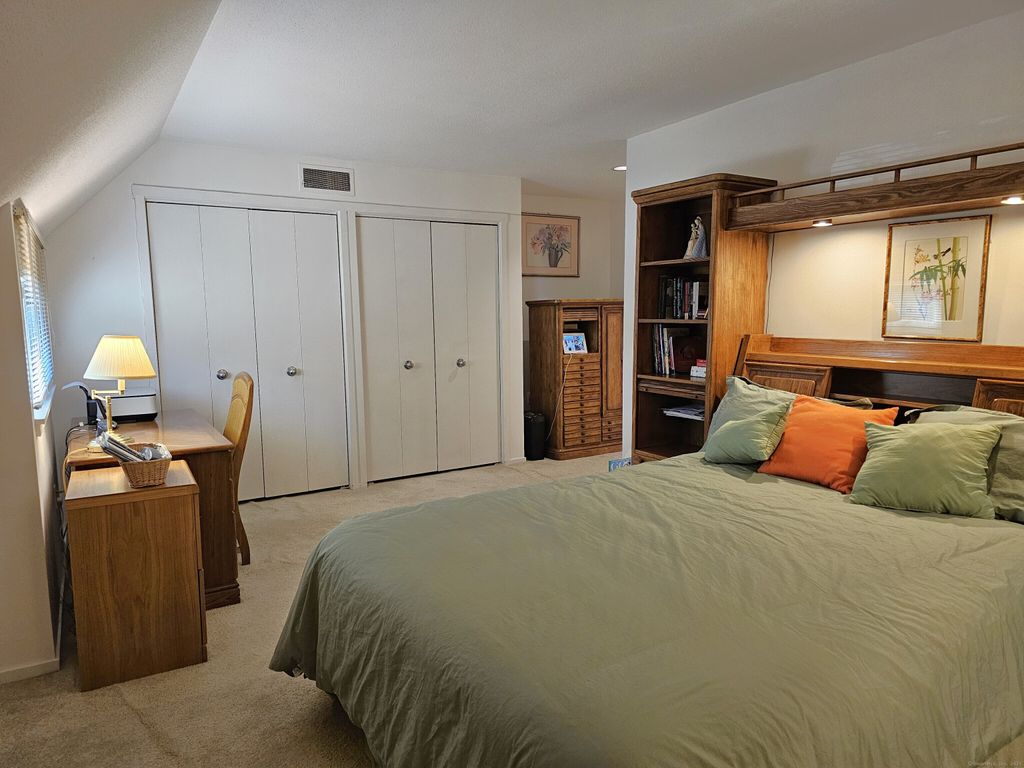 Pursue your passions in the gorgeous, peaceful surroundings of Farmington Woods, a gated community on 375 wooded acres! Stunning 2 bedroom/2 bath end unit in a 4plex building - walking distance to the Mallard pool, Mallard tennis court, and community garden. One of the bedrooms is an ensuite!!! Enjoy the wood-burning fireplace in the oversized living room with an amazing, vaulted ceiling. The serene deck - off the dining area's sliding glass doors - is complete with stunning views of the 5th fairway. A must see!! The home is on the 2nd floor, all one level, with a Southern exposure, and new windows throughout. One-car detached garage with a generous-sized storage room. The Farmington Woods community boasts 4 outdoor pools, 5 tennis courts, 2 pickleball courts, a paddle ball court, a multi-purpose ball field, community garden, and a pond (perfect for kayaking). The 18-hole championship golf course winds its way through the amazing community. The clubhouse has a full-service pub & restaurant, ballroom, games room lounge, and golf pro shop. Golf and driving range are available for an additional fee. HOA $554.23/month and District fee $414.95/quarter. HOA fees include cable/internet and $35/mo restaurant food/beverage credit. Very special property for the price - get ready to live the lifestyle you have been dreaming of!