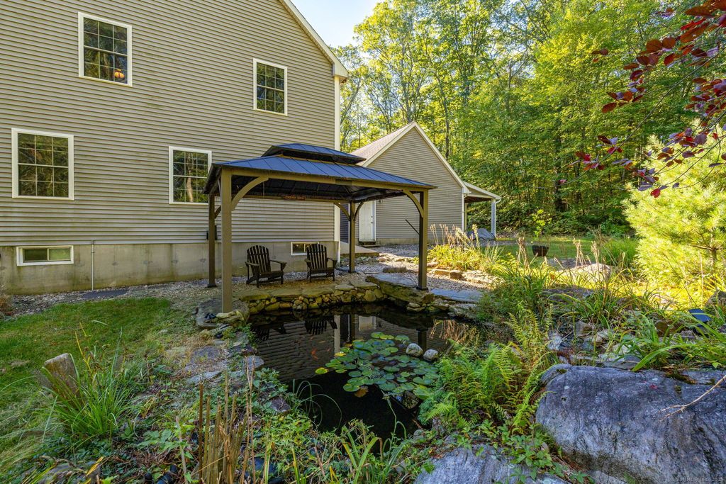 You'll fall in love with this stunning custom-built Colonial nestled on over 4 private acres! This beautifully designed home features a gourmet country kitchen with rich wood cabinetry, a Bbar, and a custom coffee/wine bar-all open to a spacious dining room with wide plank floors. The DR flows seamlessly into a breathtaking LR with a soaring beamed ceiling, floor-to-ceiling windows, and a striking stone fireplace with wood stove insert. The first-floor primary suite offers a full bath and walk-in closet, while a convenient half bath, mudroom, and laundry area complete the main level. Upstairs, a loft overlooks the stunning LR below and leads to two oversized BRs, a full bath, and a dedicated office space that could easily serve as a 4th BR. Enjoy total privacy outdoors with multiple entertaining areas, including a covered porch area, a wraparound composite deck, overlooking a high bread above-ground pool. The stone patio features a cozy firepit and seating, a serene koi pond with pergola. Additional amenities include a shed, chicken coop, greenhouse, and a 3-car tandem garage with carport. A true hidden gem offering peace, privacy, and exceptional living-don't miss your chance to call this incredible property home!