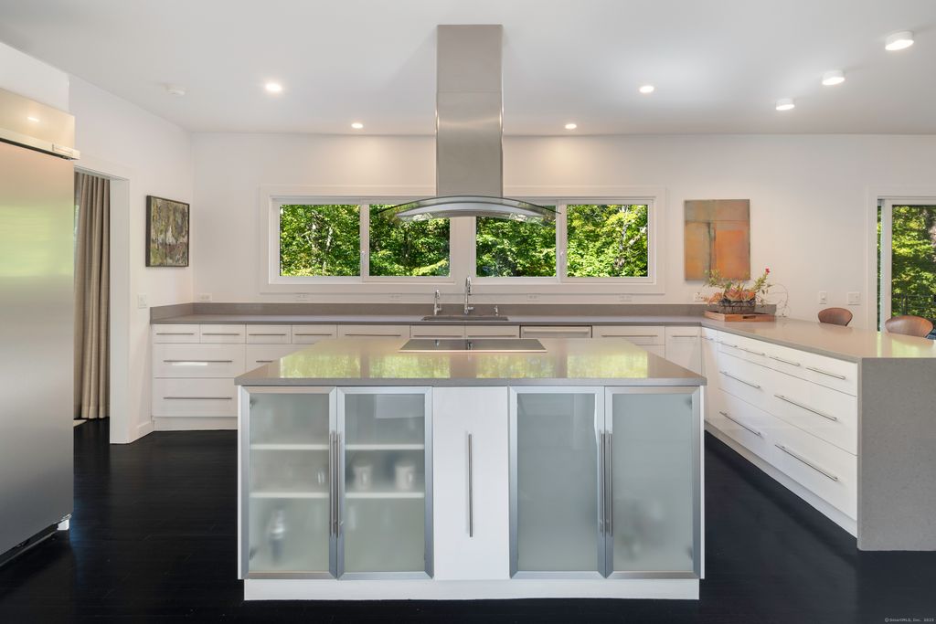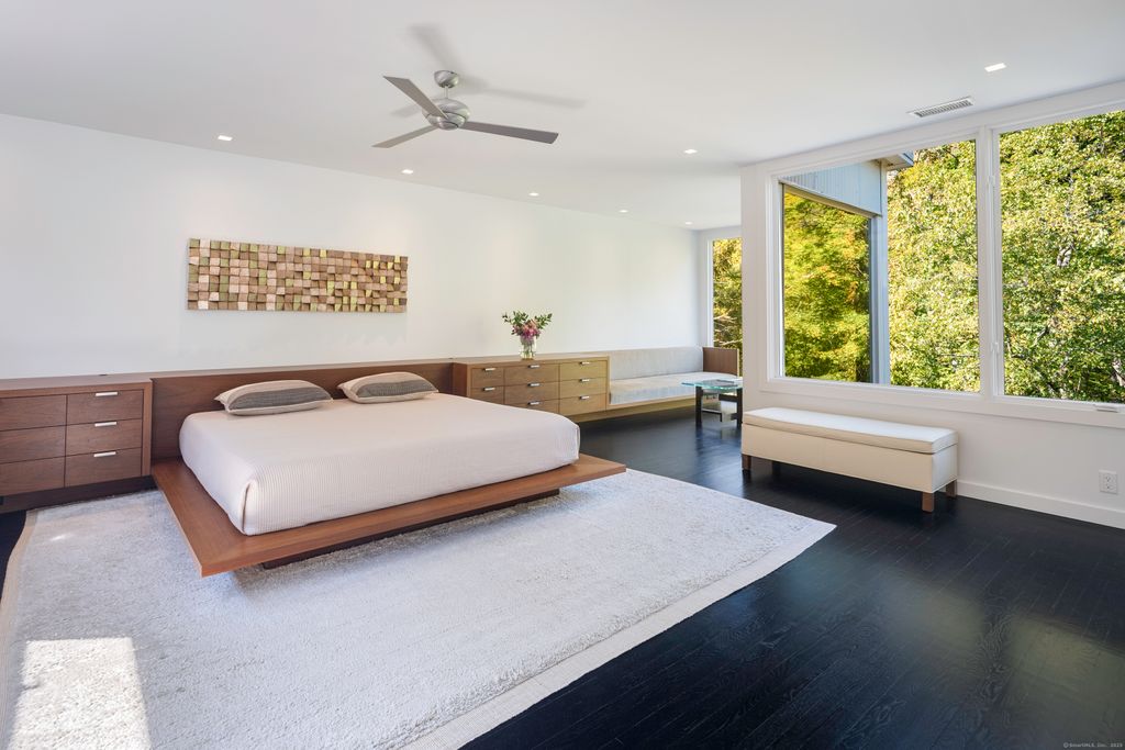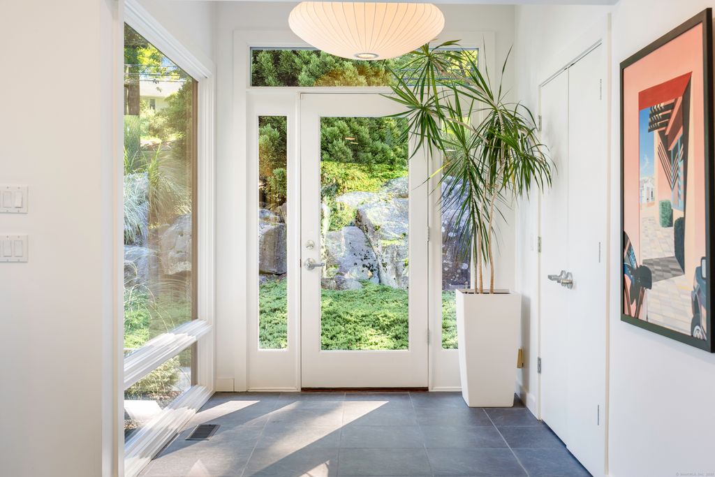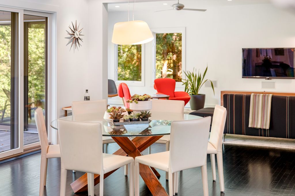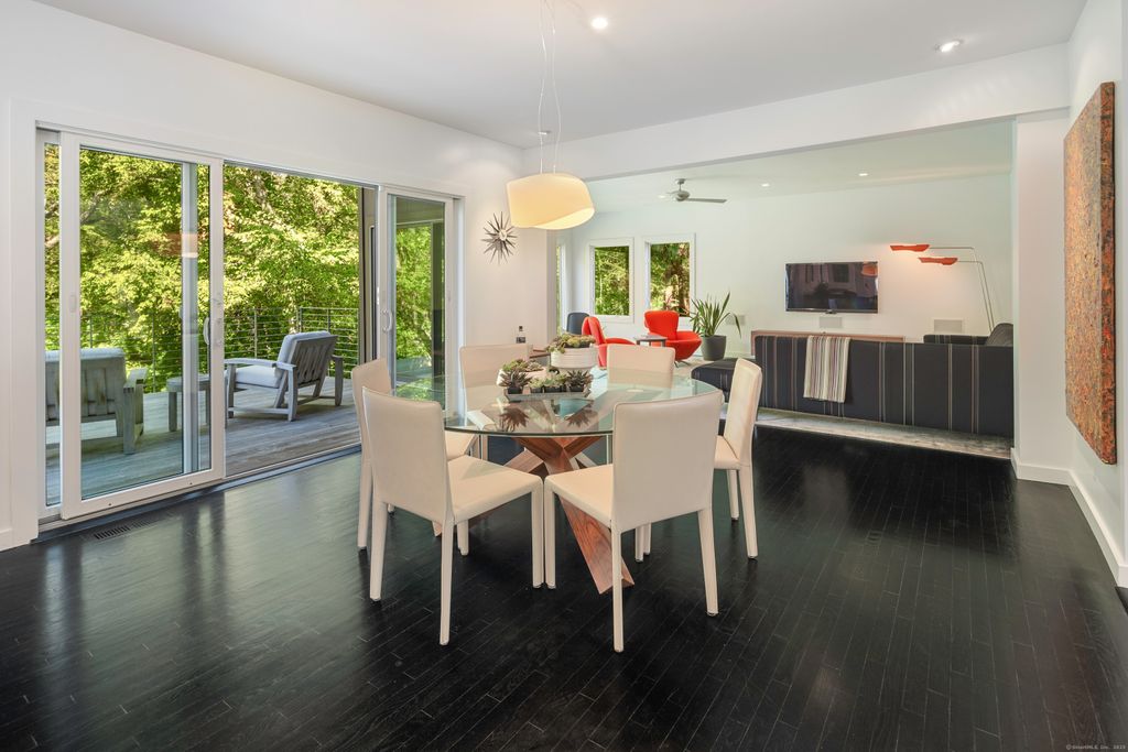 Perched high above the Goodwives River, this stunning Mid-Century Modern home offers sophisticated living in an extraordinary natural setting. Walls of floor-to-ceiling glass invite the outdoors in, seamlessly blending interior spaces with the serene beauty of the 1.8-acre private landscape. Reimagined by renowned architectural firm Joeb Moore + Partners, highlights include a dramatic cantilevered IPE deck that spans the back of the home-evoking the feeling of a treehouse floating in space. Superior finishes throughout this carefully curated home include warm walnut floors, a striking steel-wrapped fireplace, and vaulted ceilings that amplify the natural light. An entertainer's dream, this home is perfect for hosting family and friends-or simply curling up in one of the many cozy window nooks to watch the changing seasons and abundant wildlife. Ideally located just steps from the vibrant Corbin District-Darien's transformative downtown destination featuring NYC-caliber dining and boutique shopping yet only moments from the waterfront sanctuary of Great Island. A rare and inspired opportunity for design-forward, nature-infused convenient living within the award-winning Darien school district.