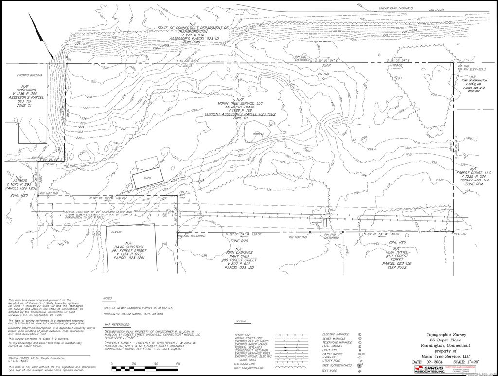 Endless possibilities await at 55 Depot Place in Farmington, which is being sold together with 8280 Forest Street as indicated in the merging lot survey by SARGIS ASSOCIATES. Combined, these parcels offer approximately 1.18 acres of prime industrial land - 0.73 acres at 55 Depot and 0.45 acres at 8280 Forest. The property features paved road frontage with public water and sewer access at the street, making it an exceptional foundation for your vision. Currently approved plans allow for a 6,000 sq ft industrial structure along with on-site storage of materials, with additional development potential available for buyers seeking to expand further. Whether your plans include a modern warehouse, professional facility, or new business headquarters, this site is ready to accommodate. Perfectly positioned just minutes from major highways, it combines convenience, visibility, and flexibility - an excellent opportunity for long-term growth and investment.