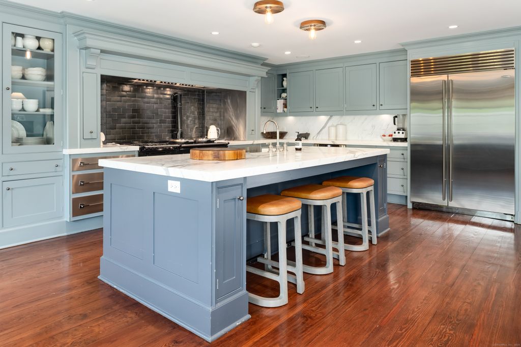 Welcome to Mead Farm - exquisitely renovated and transformed midcountry Greenwich estate that blends historic character with modern luxury. Set on nearly 6 acres in a 2 acre zone, this 9,189 SF residence offers 6 bedrooms, 6 full and 2 half baths. A recent multi-year renovation by renowned designer Thom Filicia, paired with award-winning landscaping by James Doyle, elevates the property to a rare level of refinement, harmonizing timeless design with modern comfort. Originally built in 1846, the home features wide-plank floors, copper gutters, 7 fireplaces, and a wraparound porch. The rebuilt water tower adds a gym, wine room, full bath, and dramatic double-height office. Outdoors, enjoy gardens, terraces, pool with autocover, pond and a barn with loft and garages - just minutes from town.