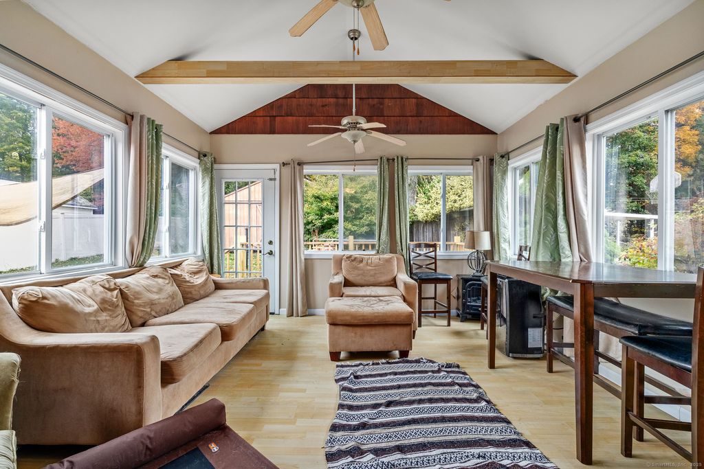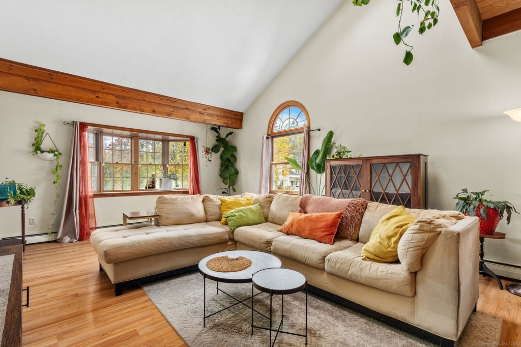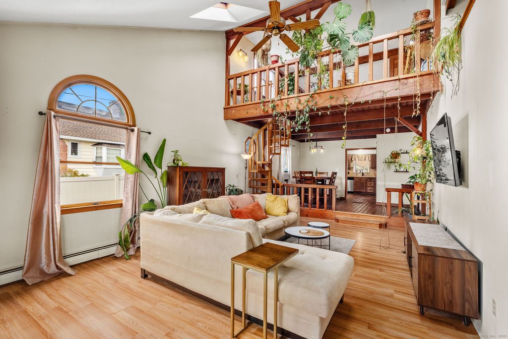 Step into natural light and character in this charming 3-bedroom, 1.5-bath home, tucked away in a quiet corner of Waterbury. Featuring a unique loft design, vaulted ceilings, and exposed wood accents, this home offers a warm, open layout that balances comfort and functionality. The bright, generously sized living room includes a bay window and skylight, flowing seamlessly into the dining area with exposed wood from the loft directly above it. The kitchen provides ample storage with wood cabinetry and connects directly to a dedicated laundry area with a closet for extra space. The main level includes a spacious primary bedroom with dual closets, a second bedroom currently used as an office, and a full bath. The office opens to a sunroom with vaulted ceilings and access to a small rear deck-perfect for enjoying natural light throughout the day. Upstairs, the loft overlooks the living area and leads to a third bedroom and a half bath-ideal for guests or a private workspace. Outside, enjoy a patio just off the deck, great for outdoor dining or grilling. A partially fenced yard offers privacy without compromising space. Conveniently located near Lakewood Park, Lakewood Lake, and Scovill Reservoir, with nearby walking trails, local restaurants, and shopping. Easy access to I-84, schools, and healthcare services makes this home as practical as it is inviting. A great opportunity to own a well-kept home with a unique layout and flexible living spaces.