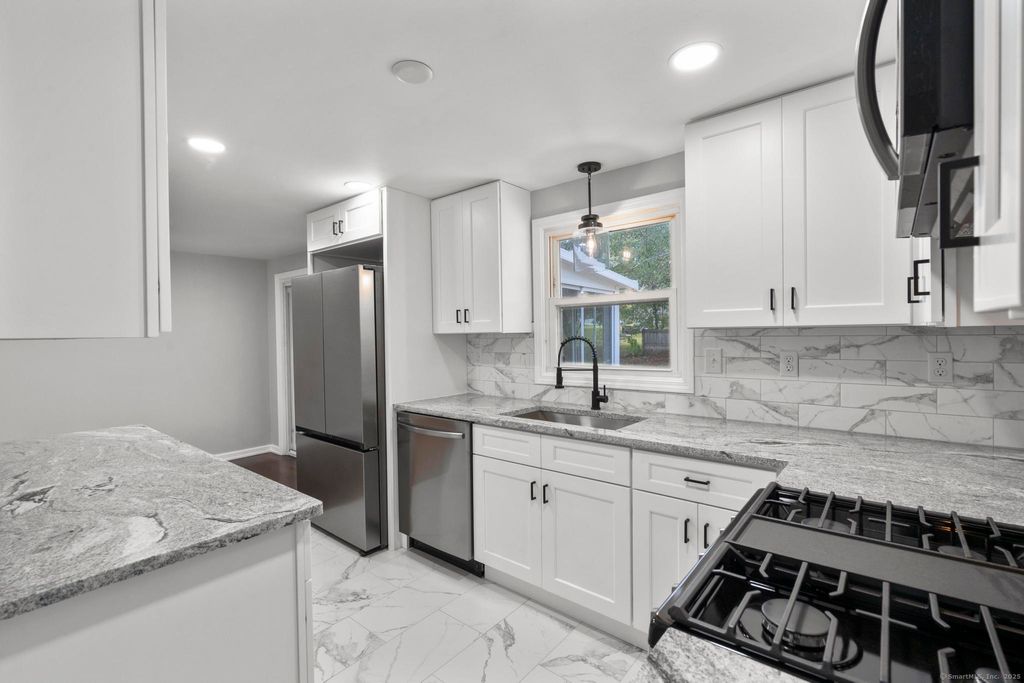 Welcome to this FULLY RENOVATED 3-bedroom, 2-bath Ranch tucked away in a peaceful Plainville neighborhood. Designed for comfort and convenience, this single-level residence features warm hardwood floors and a sunlit living room highlighted by a beautiful bay window. The kitchen opens to a spacious 3-season room with sliders leading to a private patio, perfect for morning coffee or summer evenings outdoors. Downstairs, you'll find over 900 sq ft of finished basement with endless potential for additional climate-controlled living space, a second family room, or whatever your heart desires, along with the convenience of a half bath. Additional features include central air, brand-new stainless steel appliances & white shaker cabinets in the kitchen, accompanied by beautiful tile floors and backsplash. This home also has a covered carport to protect your vehicle year-round and a level backyard ideal for gardening, play, or entertaining. Combining charm, function, and opportunity, this home offers the perfect balance of move-in comfort and room to make it your own. Don't miss your chance to enjoy all that Plainville living has to offer!