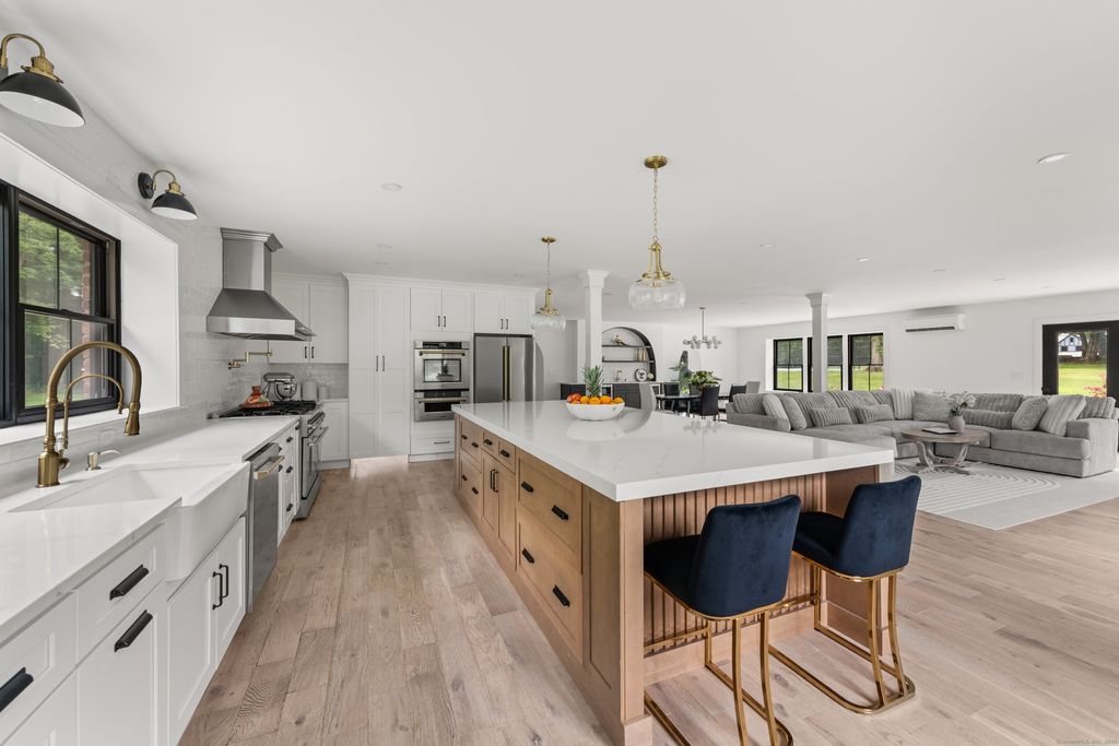 Phenomenal renovation and redesign by current owners perfectly blends traditional and modern creating an elegant and luxury living. This exceptional 5 bedroom, 4.3-bath home offers over 6600 square feet of luxurious living. Situated on a private 3.5 acres, the property boasts: stone walls, a 60ft in-ground pool and tennis/pickleball court. Upon entering, you'll be captivated by the stunning carriage house architecture and attention to quality throughout this home. The open floor plan incorporates a family room with fireplace, dining room, coffee station, and custom kitchen and offers comfortable and welcoming spaces to entertain. The tastefully remodeled kitchen features an island that can seat 8, quartz counters, ZLINE appliances, walk-in pantry with sink and back up refrigerator. Grand family room with fireplace, office, GYM room, 2 half bath, laundry room, and full bath with double sink vanity, a floating tub, and a spacious walk-in shower complete the main floor. Step up upstairs to discover 5 bedrooms and 3 full baths and one half bath along with a sauna, second floor laundry room, and multiple closets. The primary suite has its own private deck with fantastic views of the grounds, a private bath, and walk-in closet. One guest bedroom has an ensuite full bath, another has an ensuite half bath. The other 2 share a full bath.