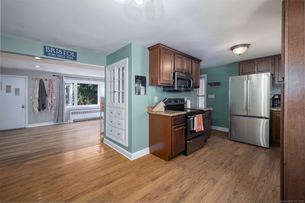 Don't miss this rare opportunity to own a charming, move-in-ready home located in a quiet, cozy neighborhood. This well-maintained 1,785 sq. ft. ranch home features three bedrooms, 1.5 bathrooms, and hardwood floors throughout, along with a spacious finished lower level. As you enter, you'll be greeted by a warm and inviting family room with views into the generous dining area. The kitchen is both practical and stylish, offering ample prep space, plenty of storage, and new stainless-steel appliances. The finished breezeway provides a perfect entry point from the driveway, garage, or backyard. Down the hall, you'll find three sizable bedrooms and a remodeled full bathroom. The finished basement offers versatility with a large multi-purpose room that can serve as a fourth bedroom, home office, or playroom. It includes storage cabinets, a new refrigerator, a half-bath, a laundry area, and additional storage in the unfinished sections. Outside, enjoy the lovely front yard and a recently fenced-in backyard, which features both a storage shed and a work shed. The property boasts a new roof, all-new stainless steel appliances, a new washer and dryer, new PVC fencing, remodeled bathrooms, and newer windows. It is connected to the city's sewer and water systems and is heated with oil. Conveniently located near highways, shopping, restaurants, medical facilities, schools, walking trails, parks, and more. **WE KINDLY REQUEST THAT ALL WRITTEN OFFERS BE SUBMITTED BY MONDAY, THE 13th**
