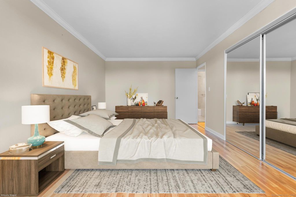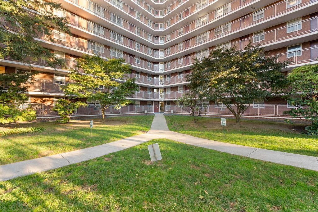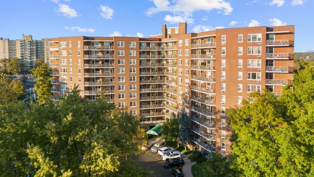 Discover a sophisticated lifestyle in this beautiful 10th floor one bedroom condo. South east facing sun-filled living spaces features an open concept living/dining area, crown molding, and wood-look flooring that sets an elevated tone throughout. Kitchen is bright and airy and features modern cabinetry. The serene oversized bedroom offers comfort and convenience. Marble bathroom also impresses with clean contemporary finishes. A large private balcony extends your living area outdoors, where wide angle skyline views provide the perfect backdrop overlooking Stamford watching the seasons change while you unwind at the end of each day. Additional storage is plentiful thanks to multiple oversized closets throughout the home. Residents enjoy a robust lineup of lifestyle amenities including an outdoor pool, fitness center, community room, playground, reserved parking, secure gatehouse entry with security guard, and private storage. Monthly HOA fees cover heat, hot water, cooking gas, and basic cable, delivering exceptional value. Situated steps from Tully Health Center and minutes from Downtown Stand, major highways, public transportation, shops, and restaurants, this home blends luxury and everyday convenience - your ideal downtown retreat awaits.