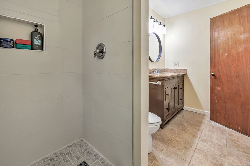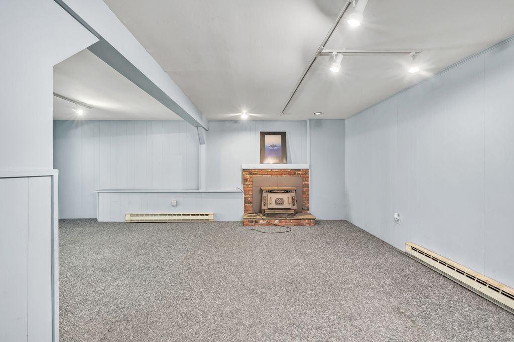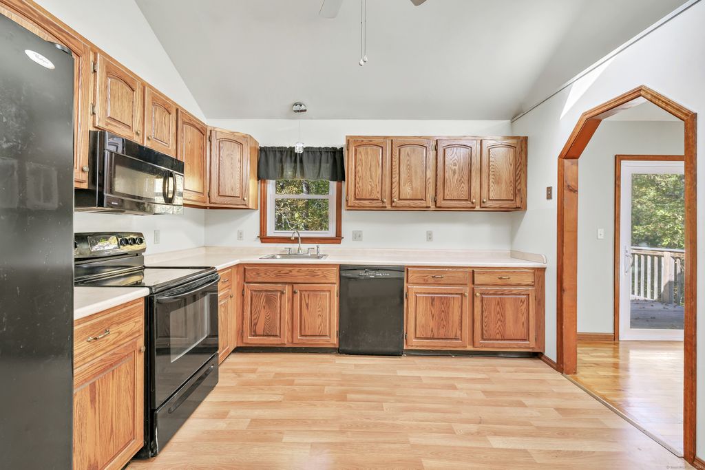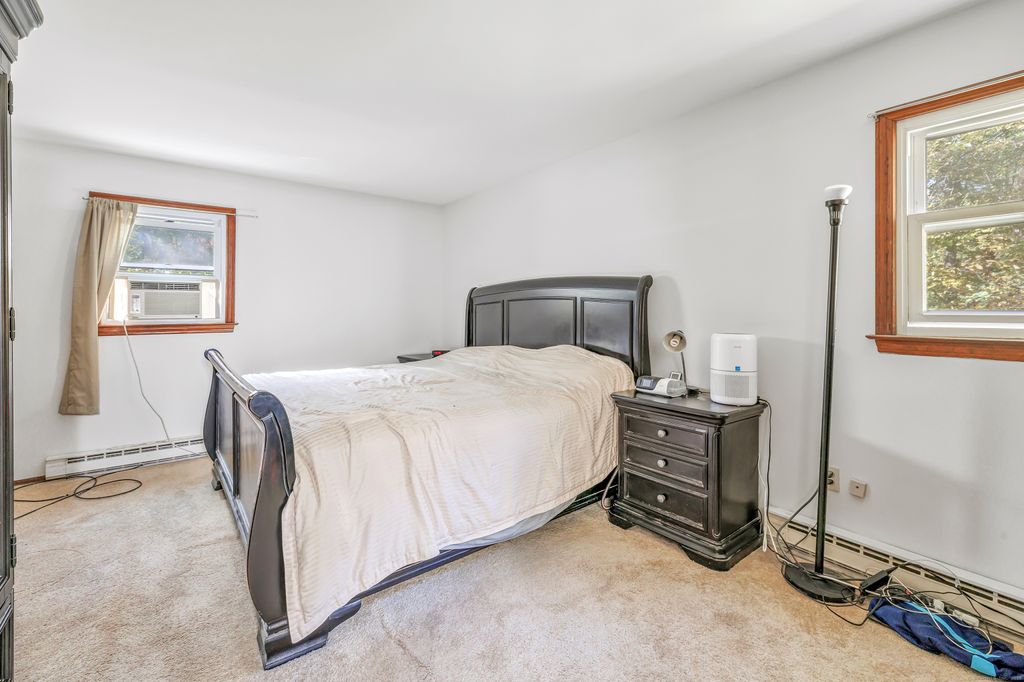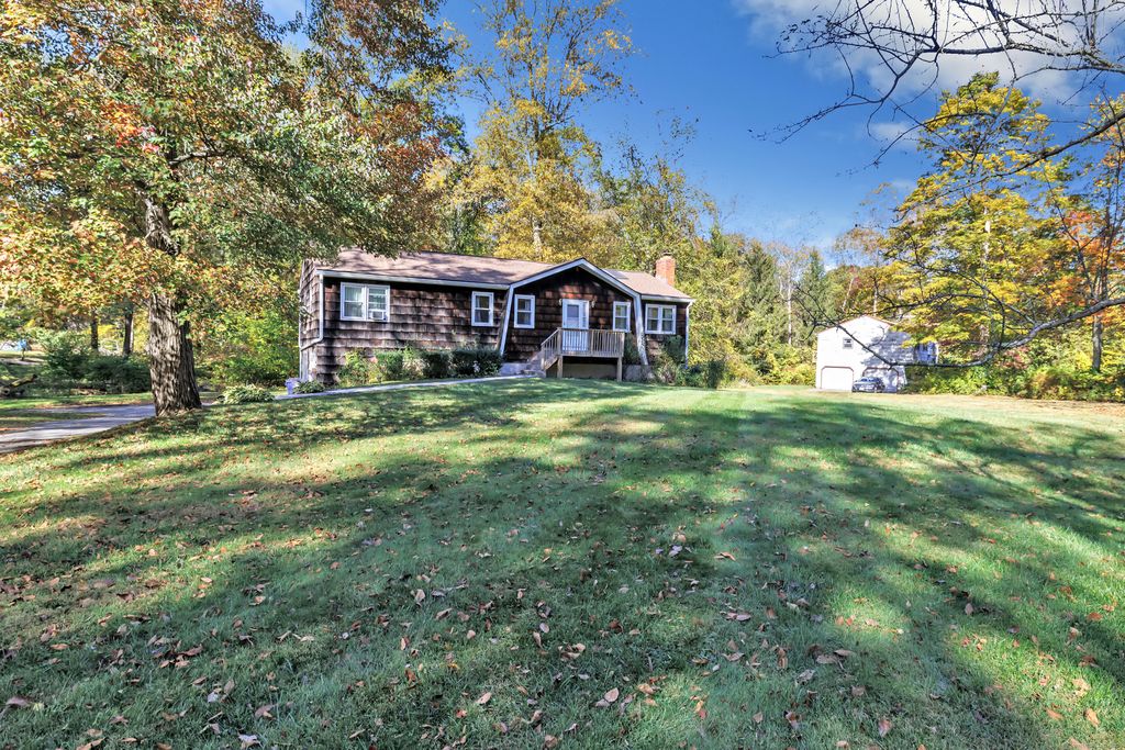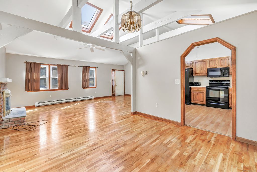 Fantastic value in a prime location! Perfectly situated near schools, shopping, and convenient commuting routes, this well-priced 3-4BR/2.5BA ranch offers incredible potential to create your modern dream home. The open and airy living and dining rooms features soaring cathedral ceilings, abundant natural light, wooden beams, and a cozy wood-burning fireplace. The fully equipped kitchen provides a functional layout ready for your personal touch. Enjoy the level, tree-lined backyard as well as the deck just off the dining room. The primary suite boasts a beautifully renovated bath, while two additional spacious bedrooms share a hall bath. The walkout lower level adds 650 square feet of versatile living space, including a fourth bedroom or home office and an oversized recreation room-perfect for play, work, or guests. Five-year-old roof and newer windows. Don't miss this opportunity!