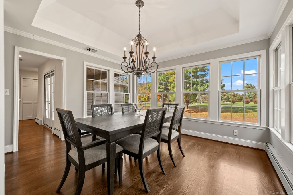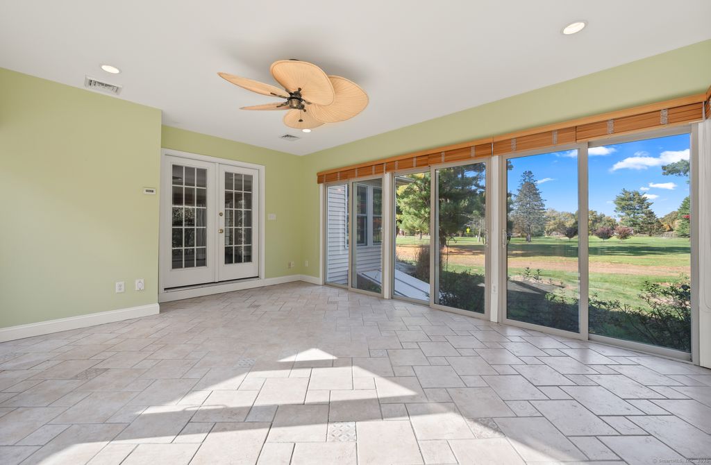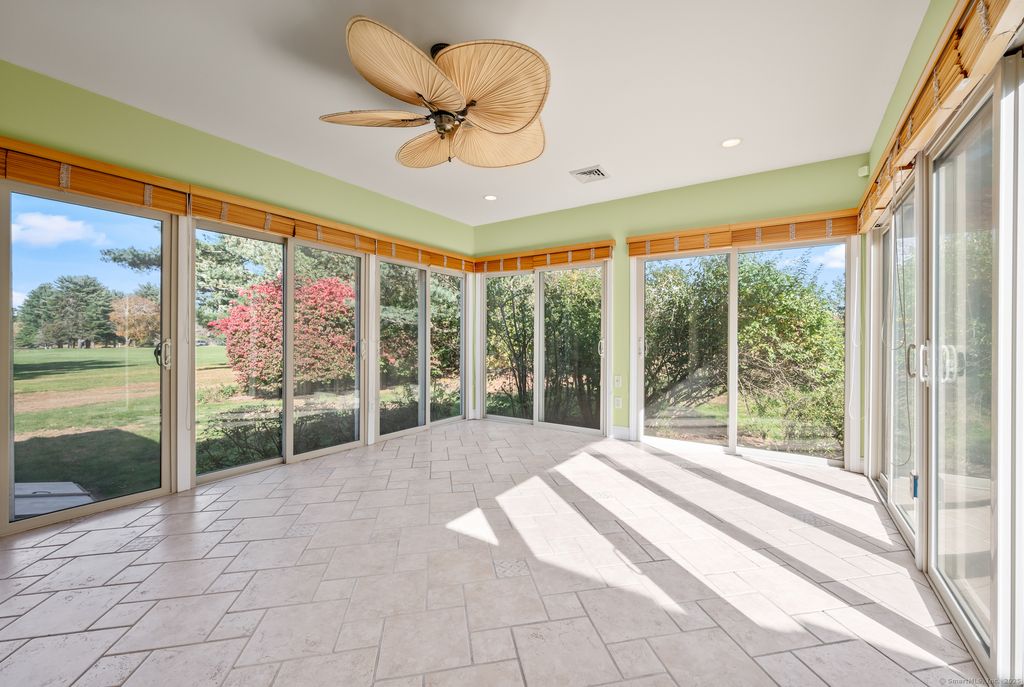 Beautiful home on the 2nd hole of Manchester Country Club. This is a single family home with no HOA fees. This home was designed for entertaining! The spectacular eat-in-kitchen boasts a center island with prep sink, glass front accent cabinets, a butler's pantry/wet bar with sink, and updated appliances including a beverage refrigerator, gas cooktop, wall oven, microwave/air fryer, refrigerator with insta-view glass front and dishwasher. Butlers pantry could be used as a wet bar. Atrium doors lead from dining area to covered patio. The kitchen is open to the dining room with tray ceiling and three walls of windows- looking out at the golf course. Two pillars subtly delineate the dining room from the living room. Hardwood flooring seamlessly connects the dining room to the living room with gas fireplace. French doors lead from the living room to the sunroom, which is heated and has windows and sliders on all exterior walls. Sliders lead to a 2nd private patio. The primary bedroom suite has hardwood flooring, a walk-in closet and a primary bath with walk in steam shower, 2 separate vanities with sinks and a tile floor. The 2nd bedroom is conveniently located across the hall from a 2nd full bathroom, with jacuzzi tub & shower. Washer & dryer hook ups are on the main level off of the kitchen. The 4-car tandem garage is huge. Stairs in garage lead to the floored walk-up attic with lighting & storage closet. Golfers, this is a MUST SEE! Subject to probate court approval.
