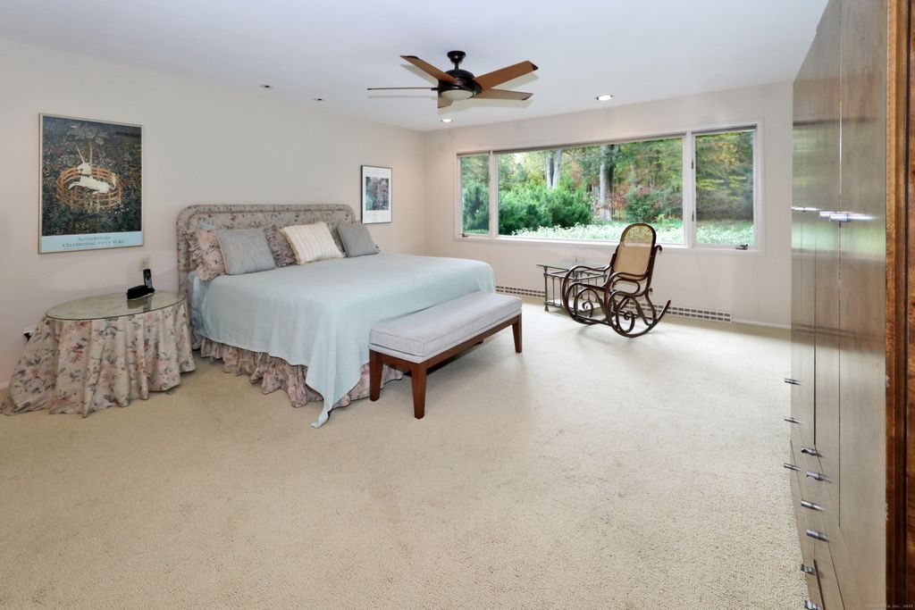 Welcome to 947 Galloping Hill Road. This true mid-century modern home was designed by the important architect Victor Civkin in 1967. This well thought out ranch has 4 bedrooms and 3 1/2 baths and is perfectly situated on a flat, private acre. Step inside the large foyer that has curved walls and a skylight. The living room is spacious with a rounded wall of floor to ceiling windows which flood the space with light. This room overlooks the professionally landscaped yard. The kitchen has white cabinets, stainless steel appliances, Subzero, granite counters, wood floor and a slider to the deck. The dining room has beautiful built-ins and a wood floor. There is also a curved wall of windows. The primary bedroom has a wall of closets, a full bath and has many windows. The other 3 bedrooms are spacious, with one having its own ensuite. The family room has a large statement-making wood burning stone fireplace and a vaulted ceiling with beams. There is a slider that connects to the screened-in porch which wraps around the house. This porch is a perfect place to entertain or enjoy quiet relaxation. The lower level is partially finished with a playroom. This home has a full house generator. The property is located in a desirable area of Fairfield. It is convenient to highways, shopping , 2 Universities, 5 beaches and Metro-North. It is a very special property and balances family functionality with modern elements! Enjoy all that Fairfield has to offer!