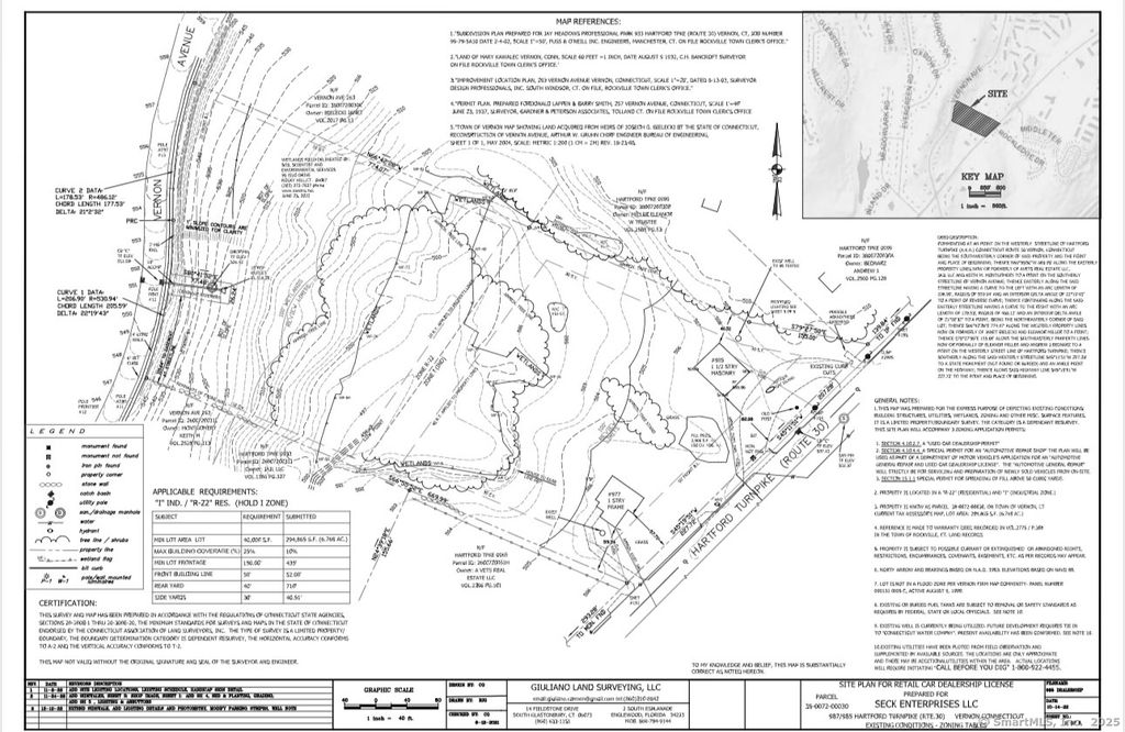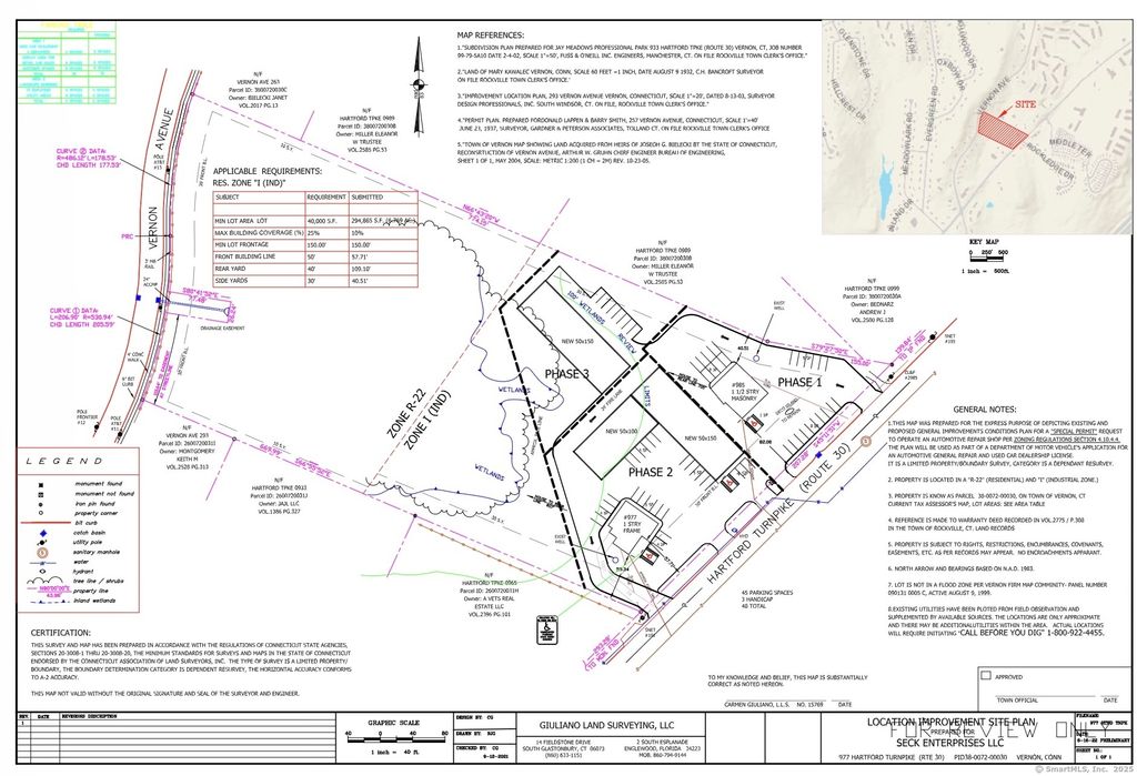 Excellent redevelopment opportunity on Route 30 in Vernon! 985 Hartford Turnpike (corner of Vernon Avenue) offers 9.1 acres with 400 feet of frontage on busy Route 30 and 573 feet on Vernon Avenue, providing outstanding visibility and access. Formerly an auto dealership, the site allows unlimited vehicle display within the designated dealership zone and features additional residentially zoned rear acreage ideal for housing development. The existing structure requires significant renovation or teardown, presenting a clean slate for redevelopment. Concept plans are in hand for three warehouse buildings, and multiple paths exist for future use including automotive, industrial, or residential. The owner prefers a long-term ground lease of the full site but will consider subdivided ground leases, a full sale, or a joint venture development. Strategically located minutes from I-84 with strong traffic counts and regional connectivity to Hartford, Manchester, and Tolland County, this high-exposure site is prime for transformation.