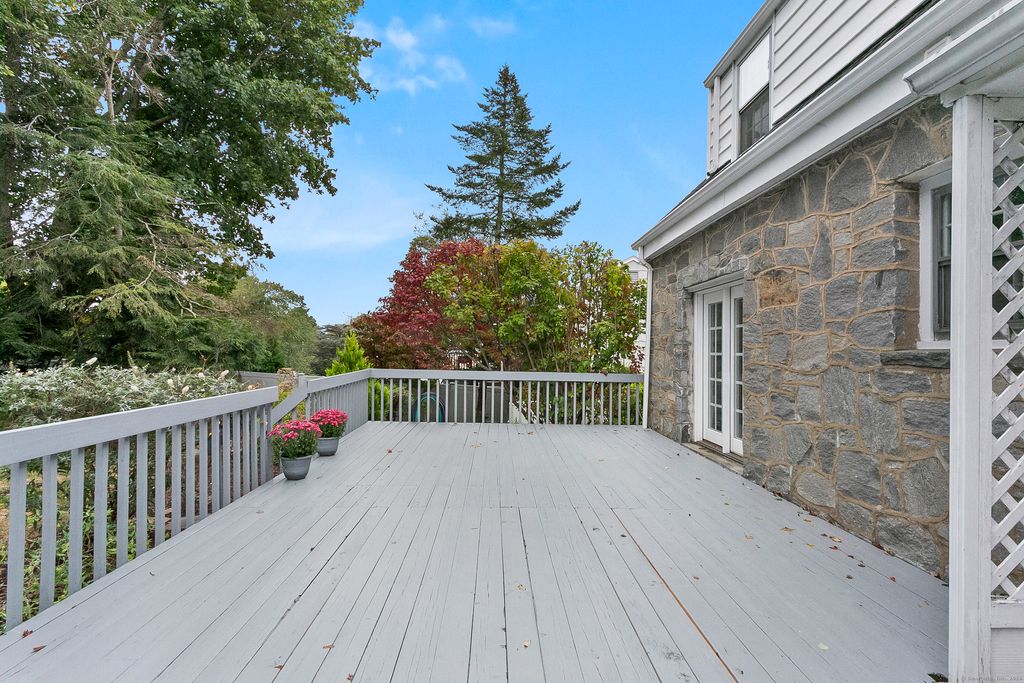 Storybook stone Cape on a quiet cul-de-sac in sought-after Fairfield University area. Set on over one-third of an acre, this inviting home features a step-down front-to-back living room with wood-burning fireplace and French doors leading to an expansive deck overlooking the large backyard. A kitchen with eat-in island, formal dining room, office/den and full bathroom complete the first floor. The lower level includes a beautifully finished family room with built-ins. A spacious two-car detached garage and whole-house Generac generator add comfort and convenience. Classic custom touches include arched doorways, glass doorknobs and hardwood floors throughout. Agent related to seller.