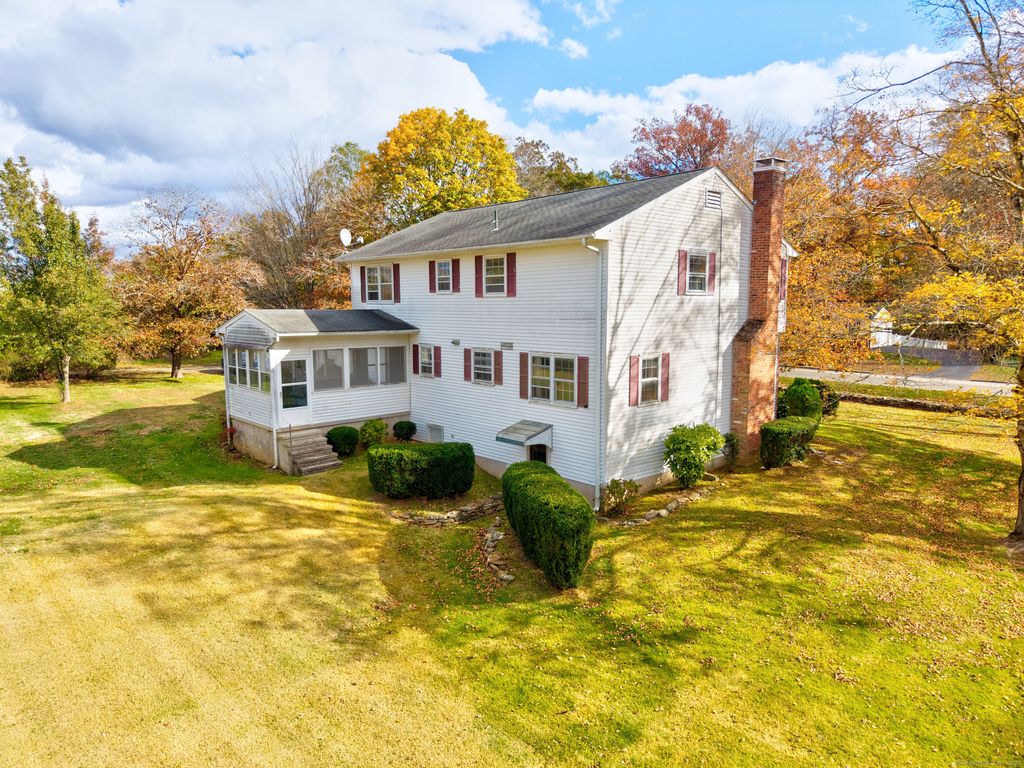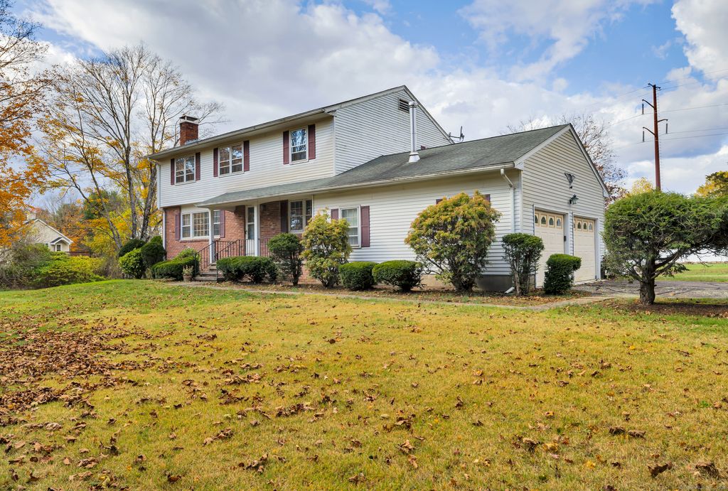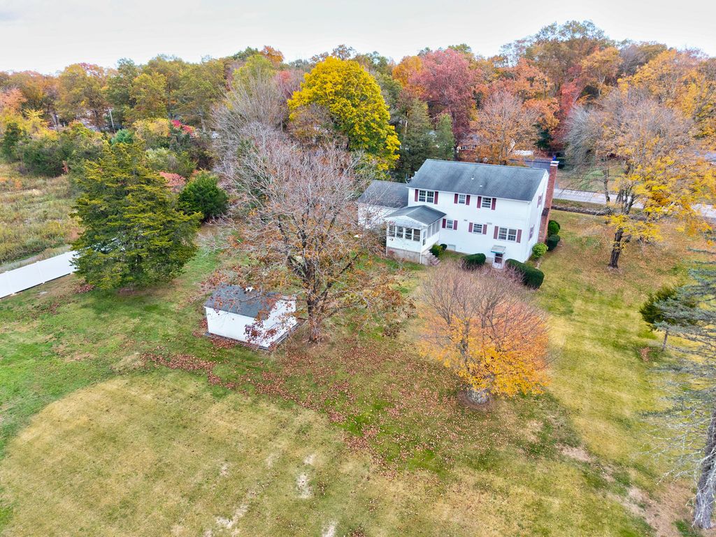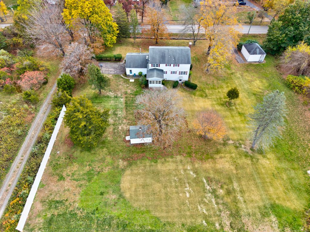 Looking for privacy and space close to town? This classic Colonial offers 4 bedrooms, 2 full baths, and sits on a level .90-acre lot. The main level features a bright living room with a wood-burning fireplace and a large picture window overlooking the front yard, flowing easily into the dining room. The kitchen includes a breakfast bar and built-in pantry storage. A spacious family room with a cozy wood stove and skylight fills the space with natural light, while the adjoining sunporch, featuring two exterior doors, opens to the backyard. Upstairs, you'll find four bedrooms, all with hardwood floors (including one currently carpeted), and a full bath with double sinks and a tub/shower combo. The large, level lot provides ample space for outdoor entertaining, gardening, or play. Additional highlights include a 2-car garage, full walk-out basement with laundry area (washer & dryer convey) and utility sink, plus an outdoor storage shed. While the home would benefit from updating, it offers an excellent opportunity to personalize and create your dream home in a desirable location. Bring your vision and make this special property shine!