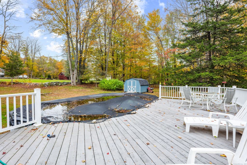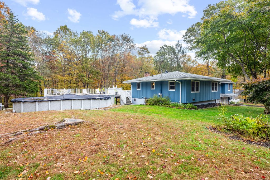 A private Brookfield retreat of style and serenity set on 2.8 private acres. This stunning 4-bedroom, 4-bath raised ranch offers a perfect blend of elegance, comfort and modern living. A brand-new driveway framed by stone pillars and extensive stone walls leads to this updated home, complete with a 2-car garage and a heated above-ground pool surrounded by a wrap-around composite deck, ideal for entertaining in style. Step inside to discover an open-concept main level with gleaming hardwood floors, crown moldings, central air, and efficient oil heat. The designer kitchen features a farmhouse sink, granite center island with breakfast bar, neutral mosaic backsplash, built-in hutch with bookshelves, and generous dining space. The sun-filled living and formal dining rooms flow seamlessly into a rustic vaulted sunroom with wood ceilings and access to the deck and pool. The primary suite boasts double closets with a spa-inspired bath featuring heated tile floors and a custom tile shower. Three additional bedrooms and two full baths complete the main level. The lower level offers a spacious tiled family room with built-in wet bar, spacious bonus room and full bath with heated floors and towel bar, ideal for guests or extended family. Meticulously maintained with newer windows, shed and sprawling lawn. This exceptional property combines many recent updates, tranquility and privacy, in one remarkable home. Convenient location close to schools, shopping, restaurants and town center.