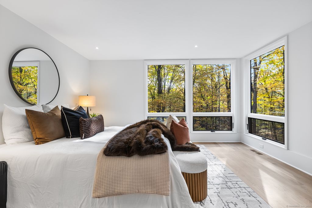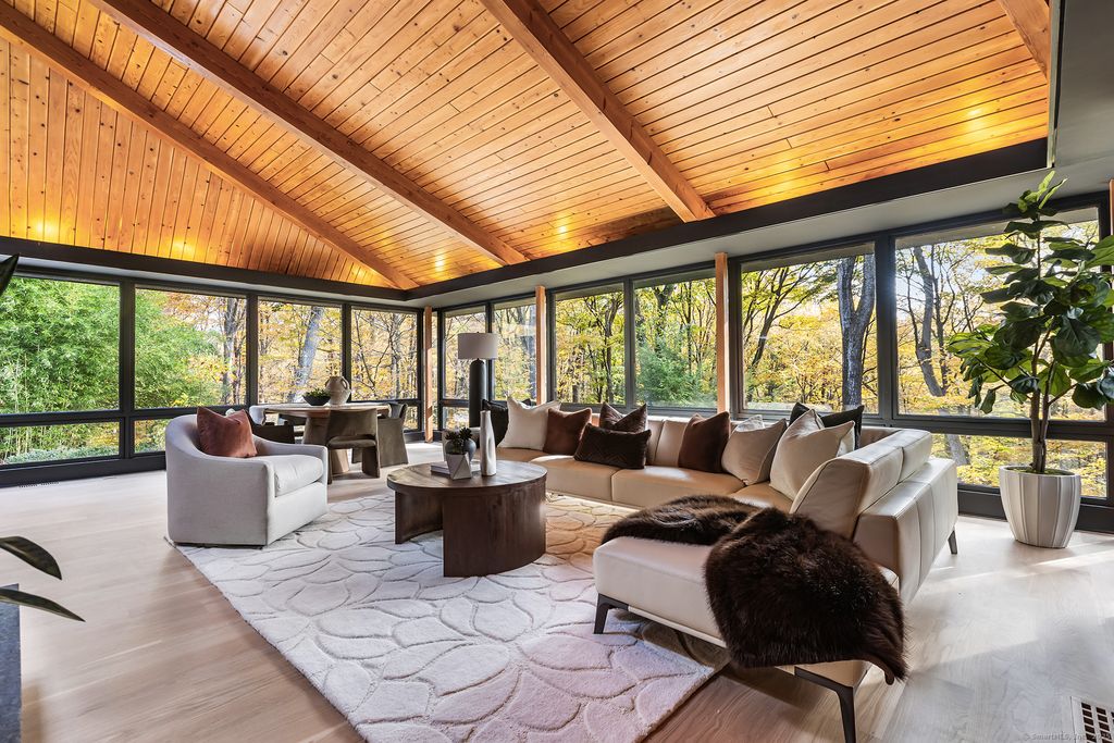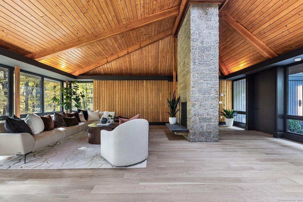 Welcome to 15 Audubon Lane, a modern sanctuary set on 4.2 serene, private acres in one of Greenwich's most coveted backcountry locations. Quietly nestled at the end of a cul-de-sac and surrounded by mature woodlands and premier estates, this architectural retreat offers a rare blend of tranquility, exclusivity, and turnkey luxury. Fully renovated to the highest standards, the 3,038-sq.-ft. residence features a new standing-seam metal roof and all-new plumbing, electrical, and HVAC systems. Inside, refined living unfolds with white oak select flooring, custom cabinetry and closets, and a gourmet kitchen featuring Wolf and Fisher & Paykel appliances set against sleek granite countertops. A new TimberTech deck creates the ideal outdoor setting for entertaining or unwinding in nature. Located in one of Greenwich's most tranquil and private backcountry settings-just minutes from the Merritt Parkway, Glenville, and Westchester County amenities-this is Greenwich backcountry living at its finest.