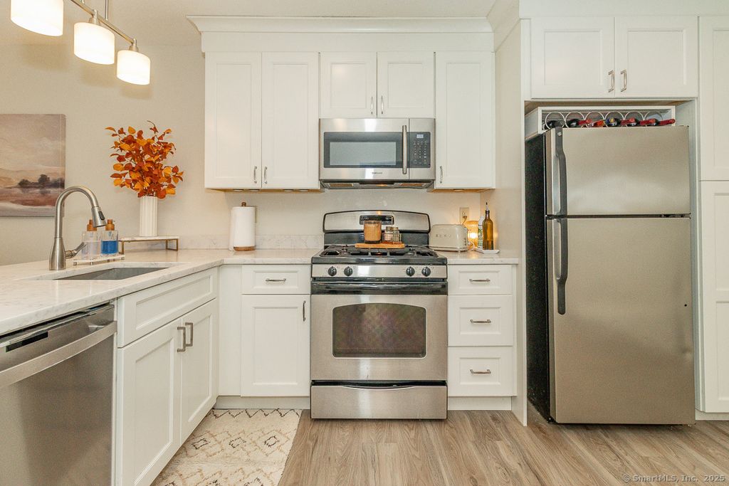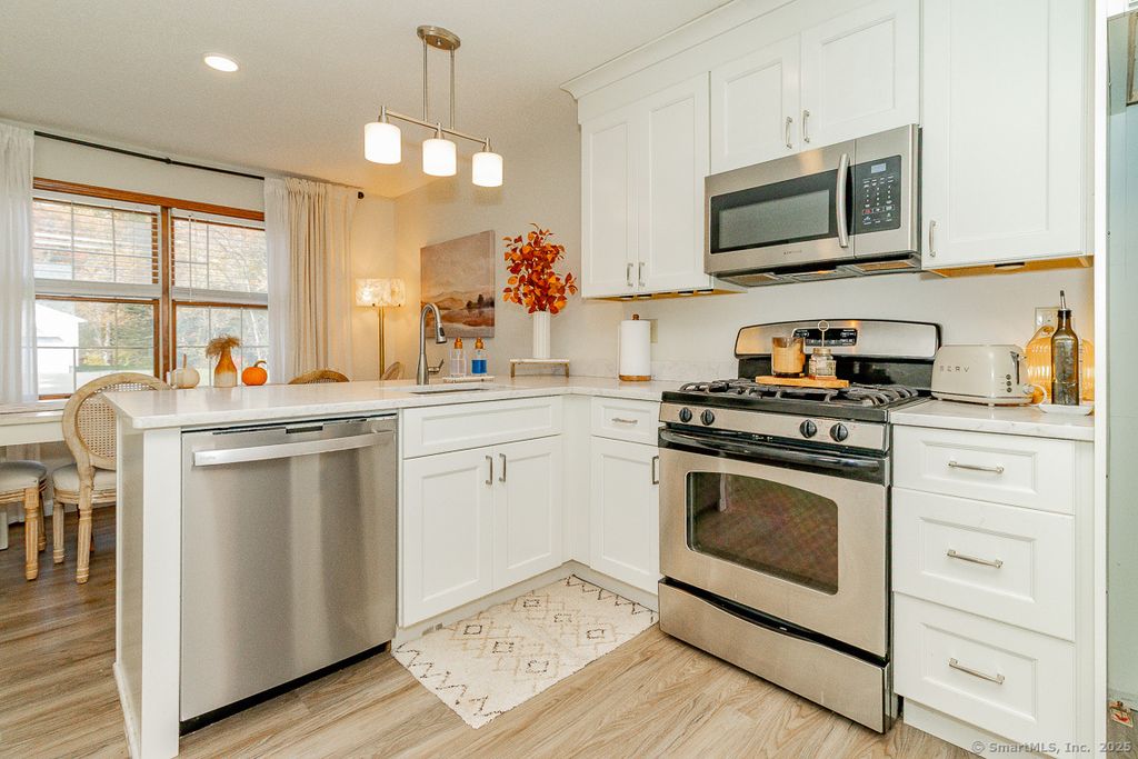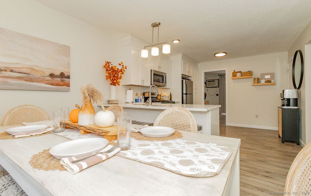 Enjoy the comfort of living in quaint Lydall Woods Colonial Village - a Planned Unit Development managed much like a condo but with a significantly lower monthly HOA ($157) along with the feeling of your own Colonial style home and the freedom of having your own yard. A rare 3 bedroom, 2 and 1 half bath END unit with its own private side entrance, you will feel right at home with the fresh updates. The remodeled kitchen with quartz counters, gas cooktop, breakfast bar with stools and a roomy dining area look right out of a catalog. Bright, open and functional with direct garage access, the half bath and the laundry just off the kitchen. The stylish living room has a wood burning fireplace and sunny east facing sliders to a private patio area with a lightly wooded view. Head upstairs to find the 3 bedrooms and 2 full baths. The primary suite is good size, front to back with a private bath and separate vanity area. You'll love walking the sidewalks through this pretty community or head across the street to visit beloved Risely Reservoir Preserve with walking trails, fishing and beautiful views. A fantastic location close to Manchester Center shopping and dining, conveniently close to I84 and I384. This home is very low maintenance with a newer high efficiency gas furnace, a replaced foundation and property management to take care of the sidewalk, streets and common areas. Come settle into this lovely community!