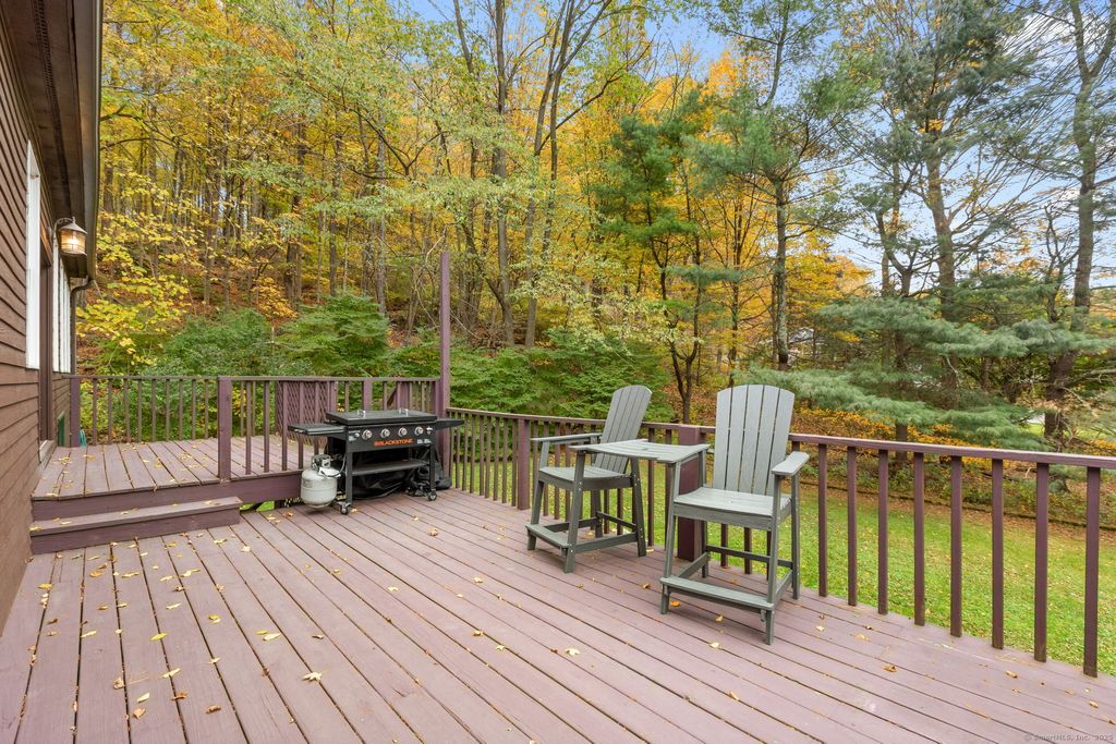 Welcome to 17 Curtis Drive, a serene and private retreat tucked away on a quiet cul-de-sac in the picturesque town of Sherman, CT. This charming 3-bedroom, 3-bathroom home effortlessly combines rustic character with modern comfort, all set on a beautifully wooded 2.03-acre lot just minutes from Candlewood Lake and the New York border. Inside, the main level boasts soaring cathedral ceilings, exposed beams, and an abundance of natural light streaming through skylights and large windows. The open-concept living and dining area centers around a cozy fireplace and flows seamlessly into a spacious kitchen featuring a center island, tile floors, and French doors that open to an expansive wraparound deck-ideal for entertaining or relaxing in a peaceful natural setting. The primary suite offers a quiet sanctuary with vaulted ceilings, a private Juliet balcony, and an on-suite bath. Two additional bedrooms and a full bathroom complete the main level. For added flexibility, a separate studio apartment with a loft above the two-car garage provides the perfect space for guests, a home office, or in-law accommodations. Additional highlights include hardwood and tile flooring throughout, a walk-out lower level with excellent potential for finishing, and a full basement perfect for storage or future expansion. The two-car garage and generous driveway provide ample parking, all nestled on a quiet, dead-end street in a tranquil, tree-lined neighborhood. Just 90 minutes from NYC, 1