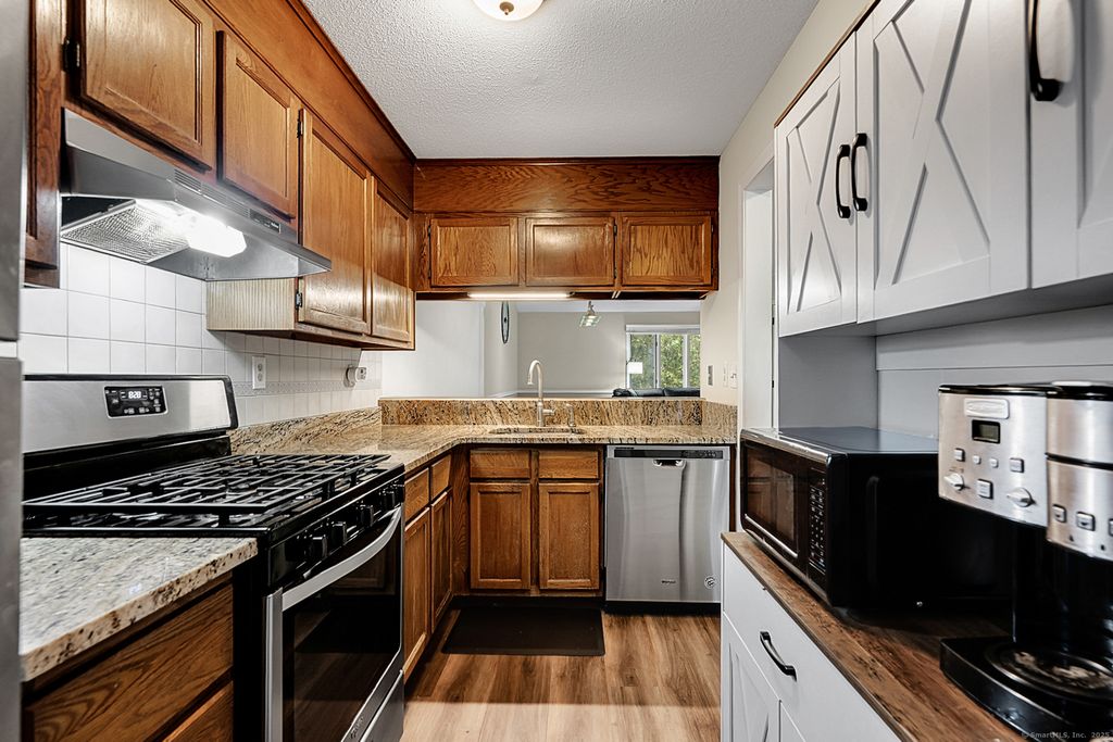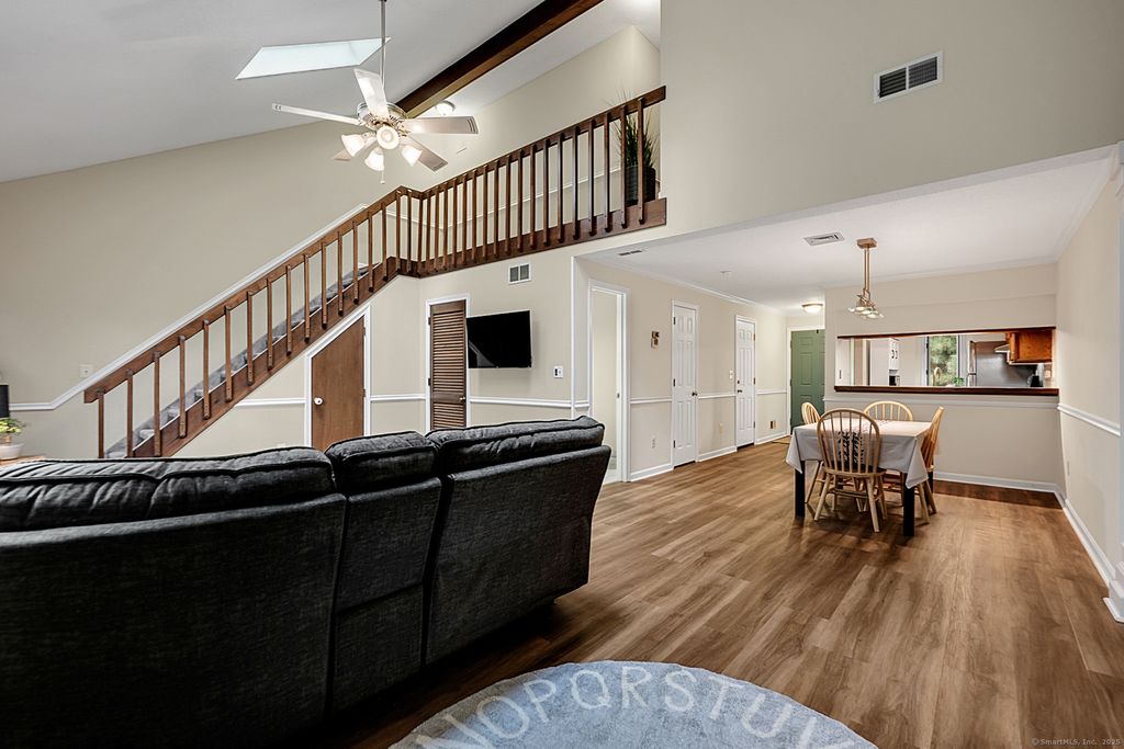 Move-in Ready Condo in The Woods, Glastonbury! Welcome to this beautifully maintained, move-in ready condo located in the highly sought-after Woods complex in Glastonbury. This bright and inviting home features 2 spacious bedrooms, 1.5 bathrooms, and an attached 1-car garage. The main level offers a great open layout, with a modern kitchen showcasing newer stainless steel appliances, a breakfast bar, and an adjoining dining area. The living room boasts soaring cathedral ceilings, an open staircase, and plenty of natural light-perfect for relaxing or entertaining. Upstairs, you'll find two generous bedrooms with ample closet space and a full bathroom. The main level also includes a half bath and a convenient laundry room. Enjoy year-round comfort with energy-efficient natural gas heat and central air conditioning. Step outside to a private deck overlooking a lightly wooded backyard-ideal for morning coffee or evening unwind time. Located in a prime Glastonbury location, this condo offers easy access to shopping, restaurants, parks, and commuter routes. A fantastic opportunity to own in one of the area's most desirable communities!