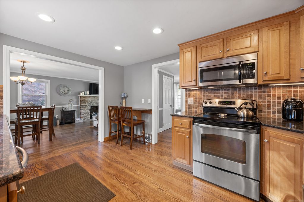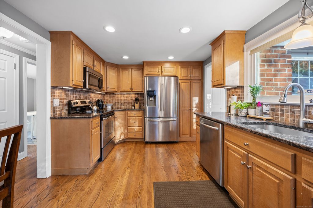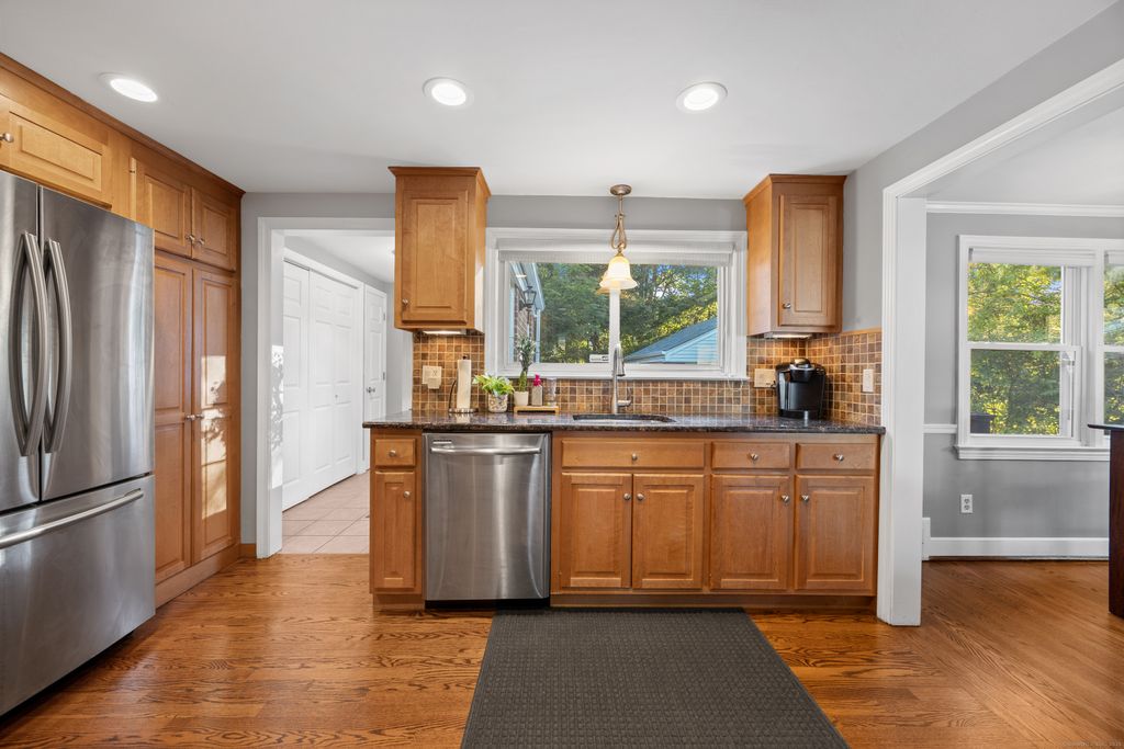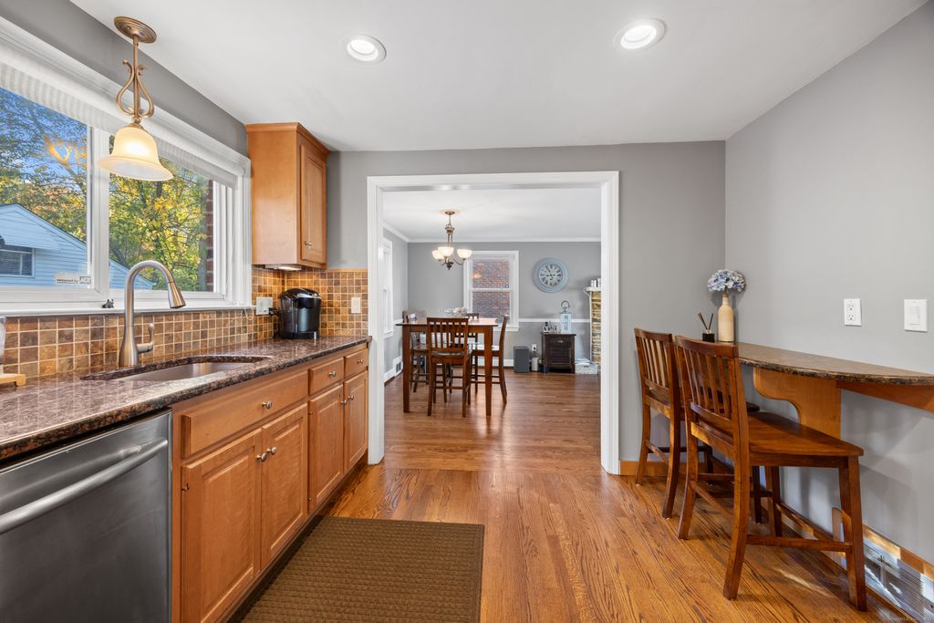 Nestled in the heart of West Hartford, this 3-bedroom, 1.5-bath brick ranch gem sits in a quiet neighborhood on the lower side of Fairwood Farms Drive. Step inside to a warm and inviting living/dining room combo with a wood-burning fireplace and gleaming hardwood floors throughout. The kitchen features granite countertops, recessed lighting, stainless steel appliances and a breakfast bar. Off the kitchen is a first floor laundry which leads to the updated half bath. Through the hallway you will find 3 ample sized bedrooms and an updated full bath with a double vanity. The primary bedroom contains 2 closets with plenty of storage space. Recent upgrades include a new roof, driveway, water heater, front and back entry doors, conversion to gas with new HVAC and furnace, and paver walkway. A beautifully landscaped level yard, a large back deck perfect for entertaining, and an oversized detached two-car garage for parking and storage complete the home. With easy access to I-84 and just minutes to West Hartford Center, Blue Back Square, West Farms Mall, and UConn Health, this move-in-ready home truly has it all!