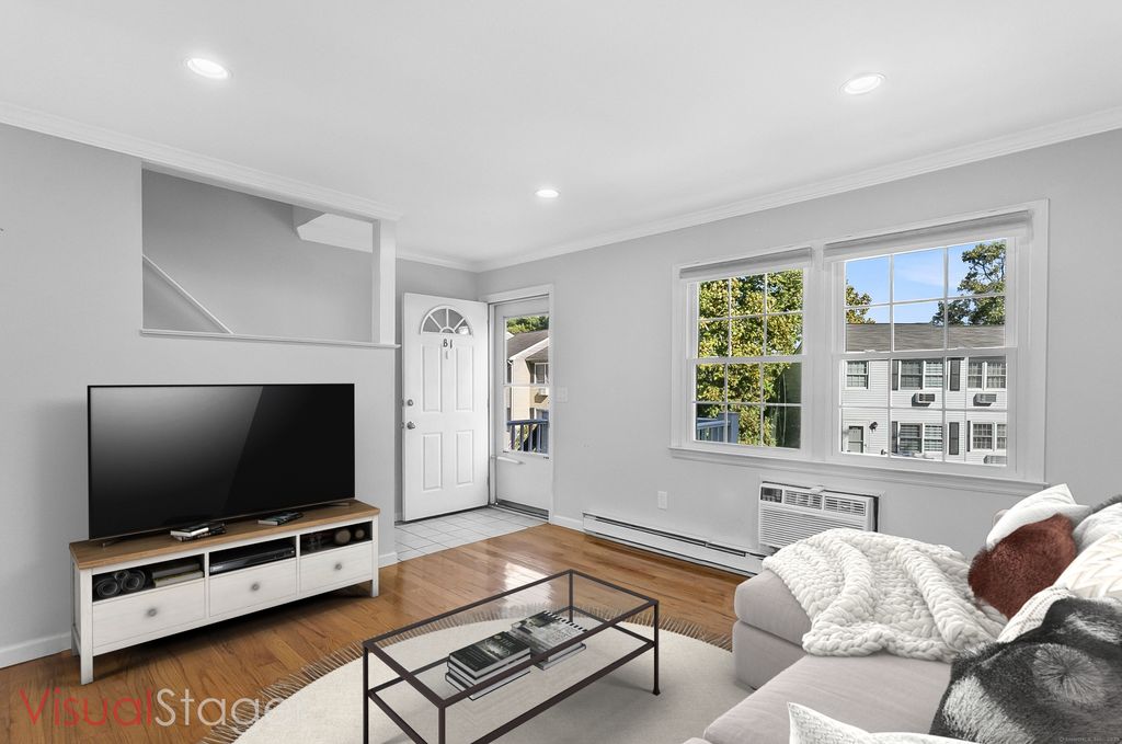 Welcome to 12 Camelot Drive, Unit B1 in desirable Norwalk. This lovely townhouse in a well maintained complex is tucked away in a peaceful residential neighborhood, and offers the space, layout and features for what a savy buyer is looking for today. Perched on a hill, the end unit features a renovated eat-in kitchen with shaker style cabinets and newer stainless steel appliances that lead to a large deck to enjoy all of your outdoor entertaining needs and lovely backyard. Living room with gleaming hardwood floors and a half bath complete the first floor. Upstairs boasts two bedrooms and a renovated full bath. Need to work from home? An additional room, accessed thru the attached garage can accommodate your remote needs or use it as a media or playroom. Washer/dryer add to the perfection. Enjoy the community pool during the summer. This home combines comfort, convenience, and a serene setting. Make your home ownership dreams a reality and move right in!