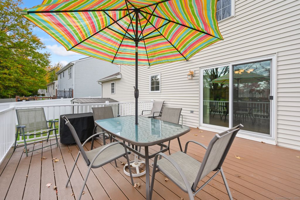 This move-in ready Wethersfield gem offers the perfect balance of comfort, thoughtful updates, and outdoor living-all just minutes from everything you need. When you first step inside, you're welcomed by a traditional entryway with tile floors and a large storage closet. A convenient half bath sits just off the hall before you arrive in the heart of the home. The kitchen impresses with granite counters, a peninsula with seating, and stainless steel appliances. It's open design connects seamlessly to the dining area, a versatile laundry room that doubles as a pantry, and the fenced in backyard through a newer sliding door that leads to the Trex deck (2023). Just off the kitchen, the spacious living room is anchored by a cozy gas fireplace, perfect for gatherings or quiet evenings in. Upstairs, you'll find 3 comfortable bedrooms including a walk in closet in the primary bedroom, and a refreshed full bath with a modern shower stall completed in 2023. Additional updates include a new water heater (2022), and a newer octagon window and rear sliding door (2018 and 2019).