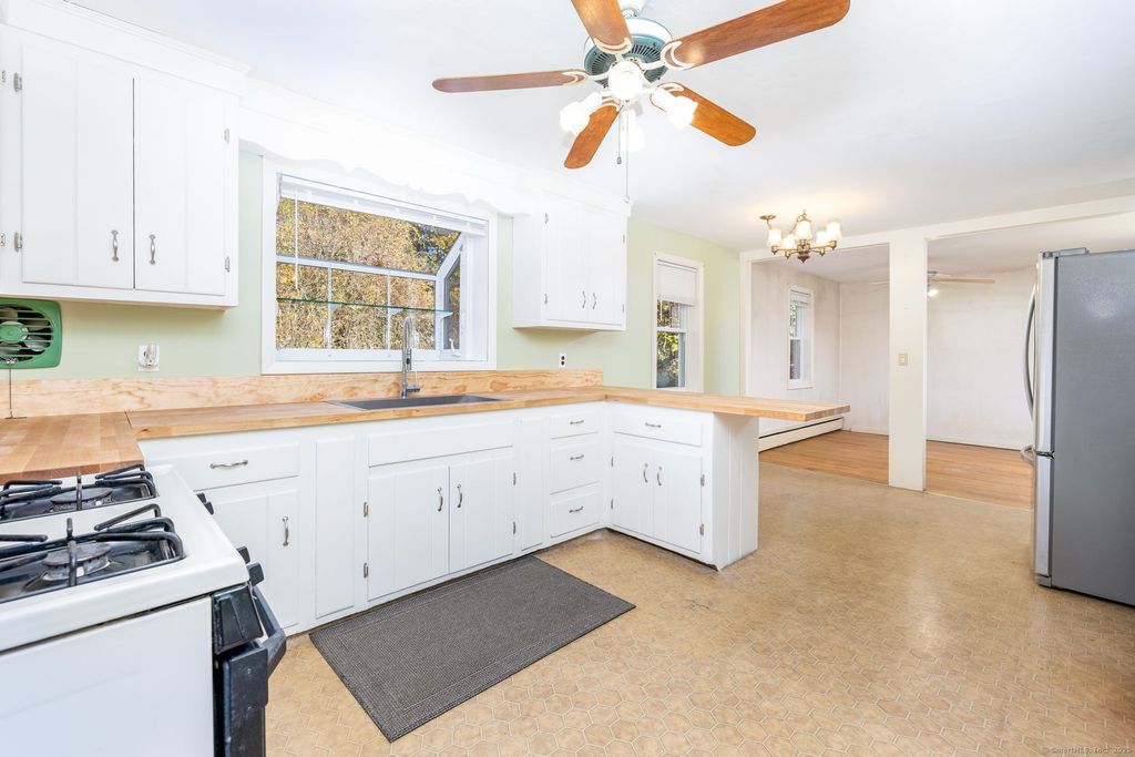 A GREAT PLACE TO CALL HOME! This ranch is set privately in a neighborhood of nice homes! OVERSIZED 2 CAR GARAGE for your toys, huge deck for enjoying the view of the gardens, METAL ROOF, vinyl siding, replacement windows, BUDERUS FURNACE, new hot water heater in 2020, newer 330 gallon oil tank and BRAND NEW BUTCHER BLOCK COUNTERS in the kitchen! Two nicely sized bedrooms, the current dining area could be walled in for another room, large living room with sliders to deck, full bathroom with tub/shower. Huge unfinished basement perfect for storage or future finishing! FENCED IN AREA for pets, kids, etc!