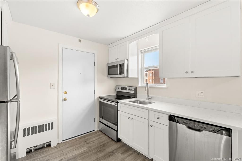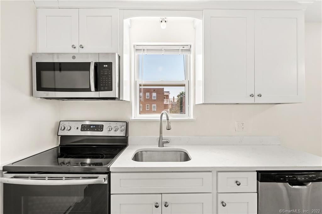 Spacious and bright 1 BR/1 Bath condo just a short walk to West Hartford Center and all it has to offer. This unit has an open floor plan with an updated kitchen featuring white cabinets, stainless steel appliances and quartz counters. The kitchen opens to a dining area and a large living room. The bedroom is good-sized and has plenty of closet space. There is a full bath with classic white tile. Off the dining area are some convenient built-ins for extra storage. Heat and Hot Water included in rent. The unit comes with a garage space (16B). The unit comes with storage in the basement. Coin-op laundry is also down the back stairs in the basement of the building. This unit is move in ready, with shopping and restaurants at your doorstep, along with the Trout Brook Trails. No pets or smoking. Application, credit/background/eviction check required. Pictures are from before current tenant moved in.
