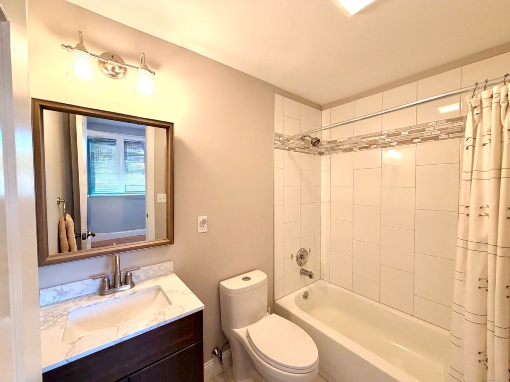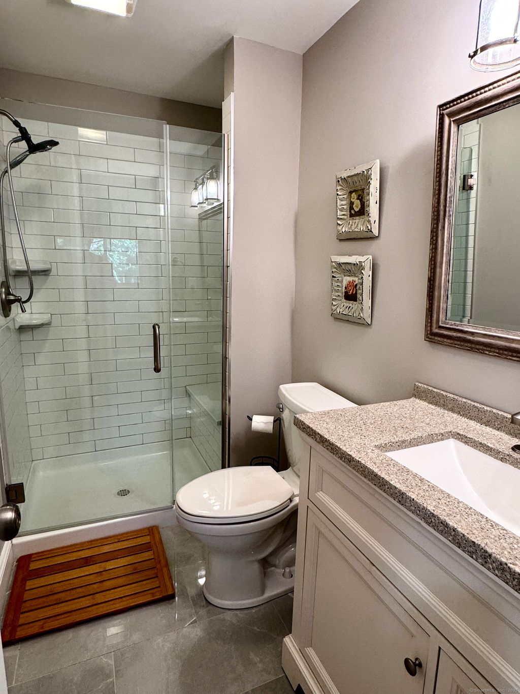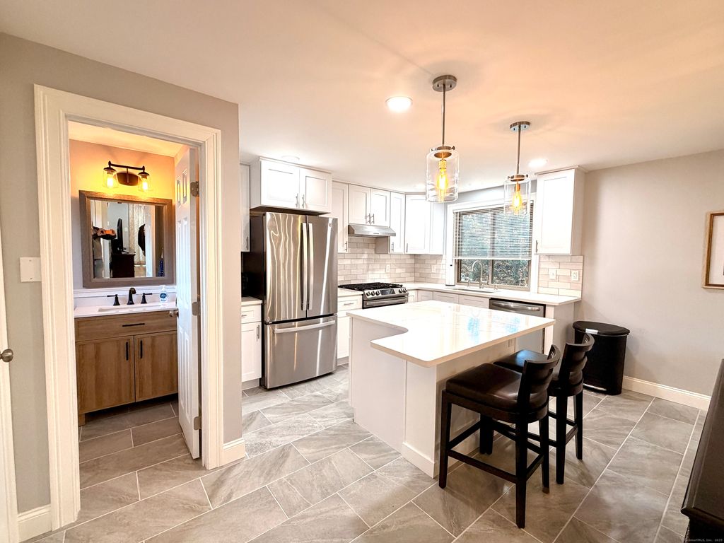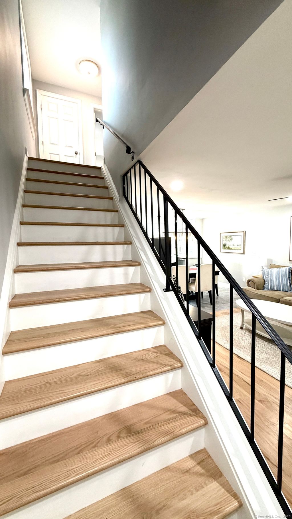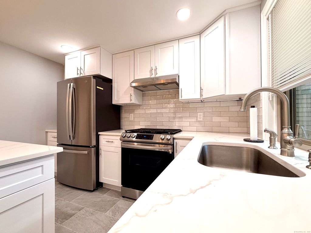 Step into this fully renovated townhome featuring luxury finishes and thoughtful design throughout. Every detail has been carefully updated-from the recessed lighting and 3-4 inch solid oak hardwood flooring to the modern tile floors that extend through the entire home. The welcoming foyer with coat closet opens to a stunning new kitchen with white quartz countertops, top-of-the-line stainless steel appliances, a center island, and a spacious pantry closet. The open dining and family room layout provides a seamless flow for entertaining, complete with a new sliding glass door leading to a private patio for outdoor relaxation. Upstairs, the primary bedroom suite offers a large walk-in closet and a bright, modern ensuite bath featuring a walk-in shower with sleek tile and fixtures. The second bedroom is filled with natural light from windows on two sides and includes its own full bath with a tub/shower combination and tiled surround. A bright hallway window, large linen closet, and additional storage space add to the home's functionality. Enjoy the convenience of a full basement with washer and dryer, two dedicated parking spaces, and access to beautifully landscaped community grounds with amenities including a pool and clubhouse, basketball courts, and secure storage for boats, and RVs. Perfectly located near Bridgeport Ave, with easy access to Route 8, the Merritt Parkway, and I-95, you'll be just minutes from excellent restaurants, shopping, and local conveniences.