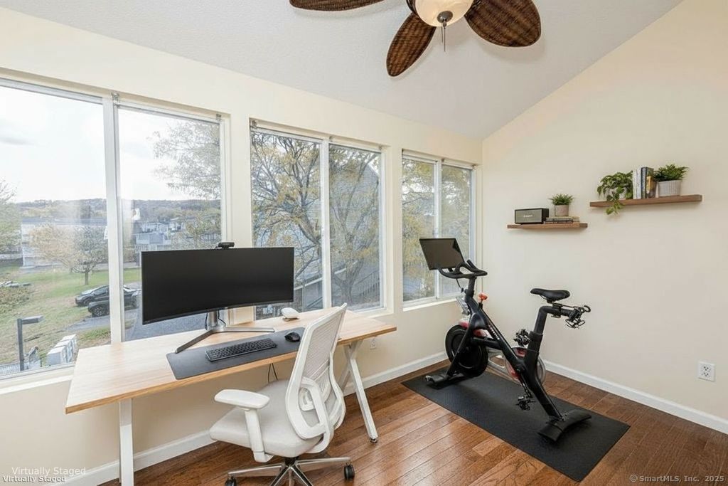 Welcome to easy living with a view! This rare one-bedroom townhouse overlooks the tranquil waters of Hamlin Pond, offering the perfect blend of comfort, convenience, and natural beauty. Step inside to an open and airy living room with vaulted ceilings that create a sense of space and light. The eat-in kitchen features brand-new granite countertops and a new oven/range - ready for you to cook, dine, and entertain. Just off the kitchen, a versatile bonus room provides the ideal spot for a home office, workout area, or peaceful reading nook. Upstairs, the primary bedroom is a true retreat with serene water views, a full bath, and a walk-in closet that also houses the laundry for ultimate convenience. Recent improvements include a freshly painted interior and a new central air compressor installed this summer, so you can move right in and enjoy. Love the outdoors? Step outside and take advantage of direct access to Hamlin Pond, where you can kayak, sail, fish, or simply unwind at the water's edge. Electric motorboats are also allowed. The boat launch is located right next to the building for easy access. With quick connections to Interstate 84, commuting and shopping are effortless. Don't miss this opportunity to own your own piece of waterfront living - it's the perfect time to stop renting and start investing in yourself.