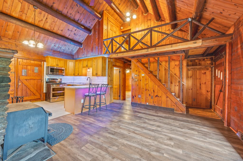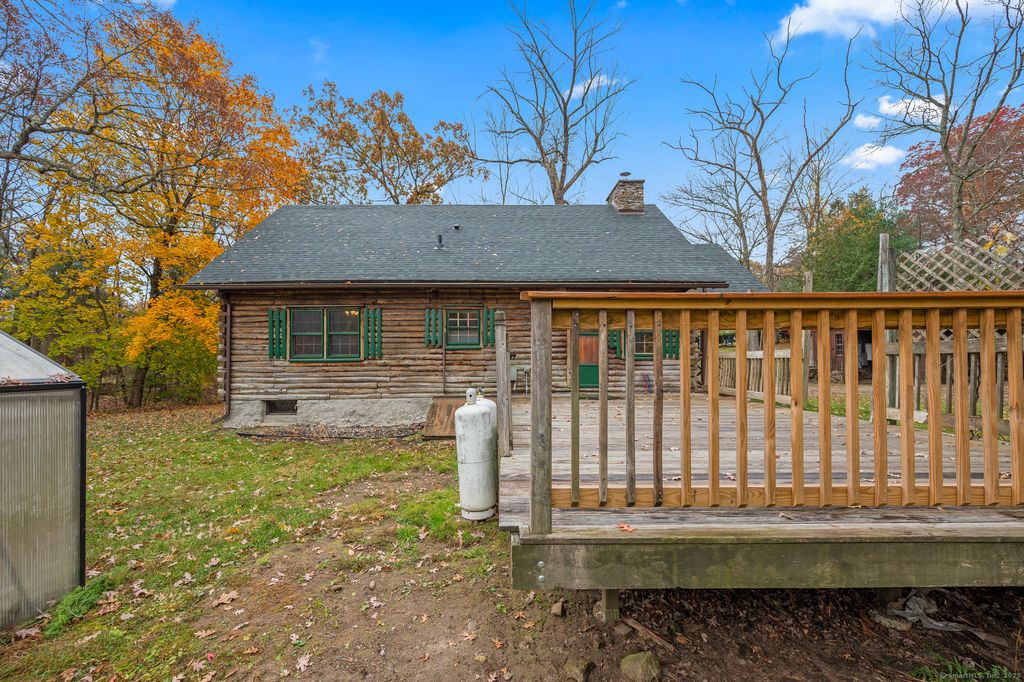 Log cabin with side porch set on 2.48 acres in a private setting. Features vaulted ceiling, stone fireplace, woodstove and open floor plan. Kitchen with granite countertops and stainless-steel appliances. New roof. Large deck. Yard suitable for gardening. Make this home yours!