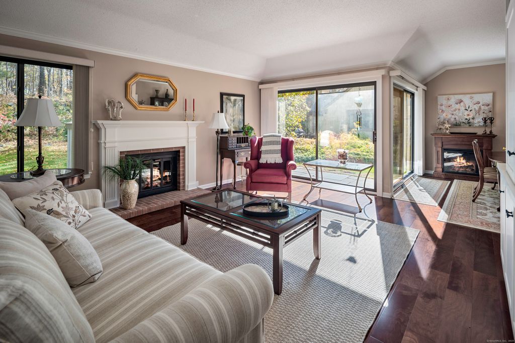 Tucked away in a community is a pristine end unit one level living "litchfield style" ranch home. The attached one car garage creates ease to have access directly into the bright and newly applianced eat in kitchen. A sprawling 1447 sq ft is perfectly designed and gives you a quite wing at one end of the home featuring a cozy office/bdrm with builtins along with a the master ensuite and a newly renovated high end quality bathroom with a walk-in shower and a seat for comfort. Tucked away in the back of the home feautures a spacious living room and dining room with 2 sliders, a fireplace, built-ins and tray ceilings overlooking the patio and the back yard.