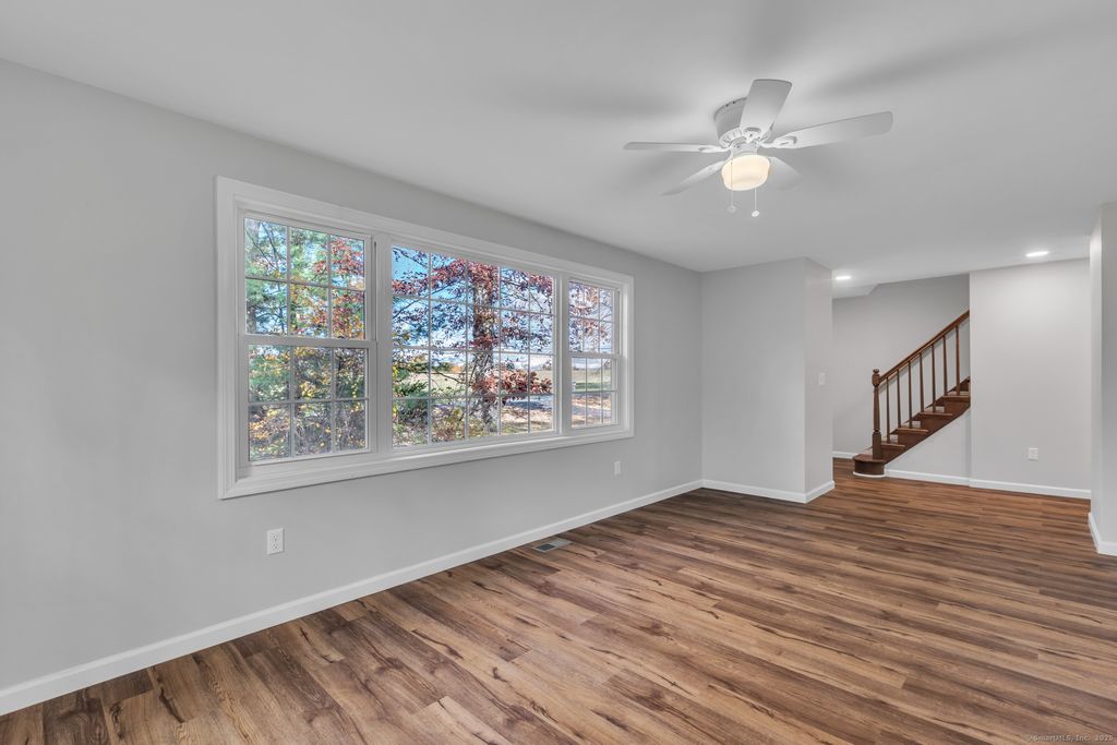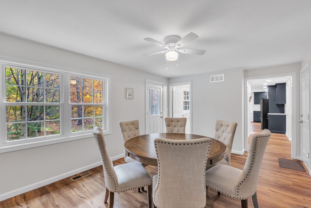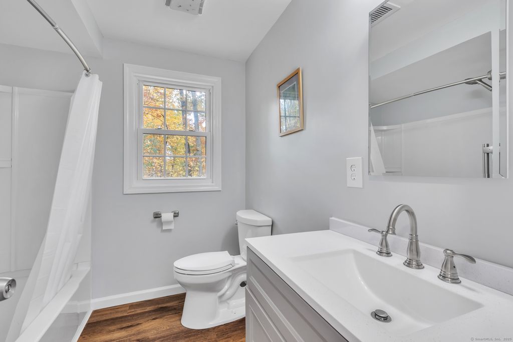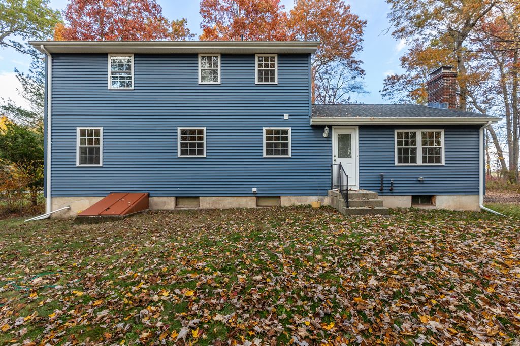 Completely renovated 1720 sq. ft. Colonial with tranquil views of rural Ellington farmlands. Situated on 0.69 acres, this home offers a new roof, siding, electrical, windows and doors, fresh paint, engineered hardwood floors, consistent 6-panel white doors, updated appliances and more. A double door transom window front entrance foyer leads to a front facing living room with oversized front window and French doors to an eat-in kitchen. The kitchen includes new cabinetry, new appliances, quartz counter tops, breakfast bar, tiled backsplashe, and abundant recessed lighting and cabinetry. The main level also includes a rear facing family room with wood-burning fireplace and backyard access, a first-floor laundry with new appliances, and a beautifully refinished full bath. The second story includes a primary bedroom with a renovated full bath, 2 additional bedrooms, and an impressive updated full common bath. The lower level is unfinished and ready for your imagination. Private south facing backyard, 1-car garage. New hatchway door 2025 and new septic tank in 2015!